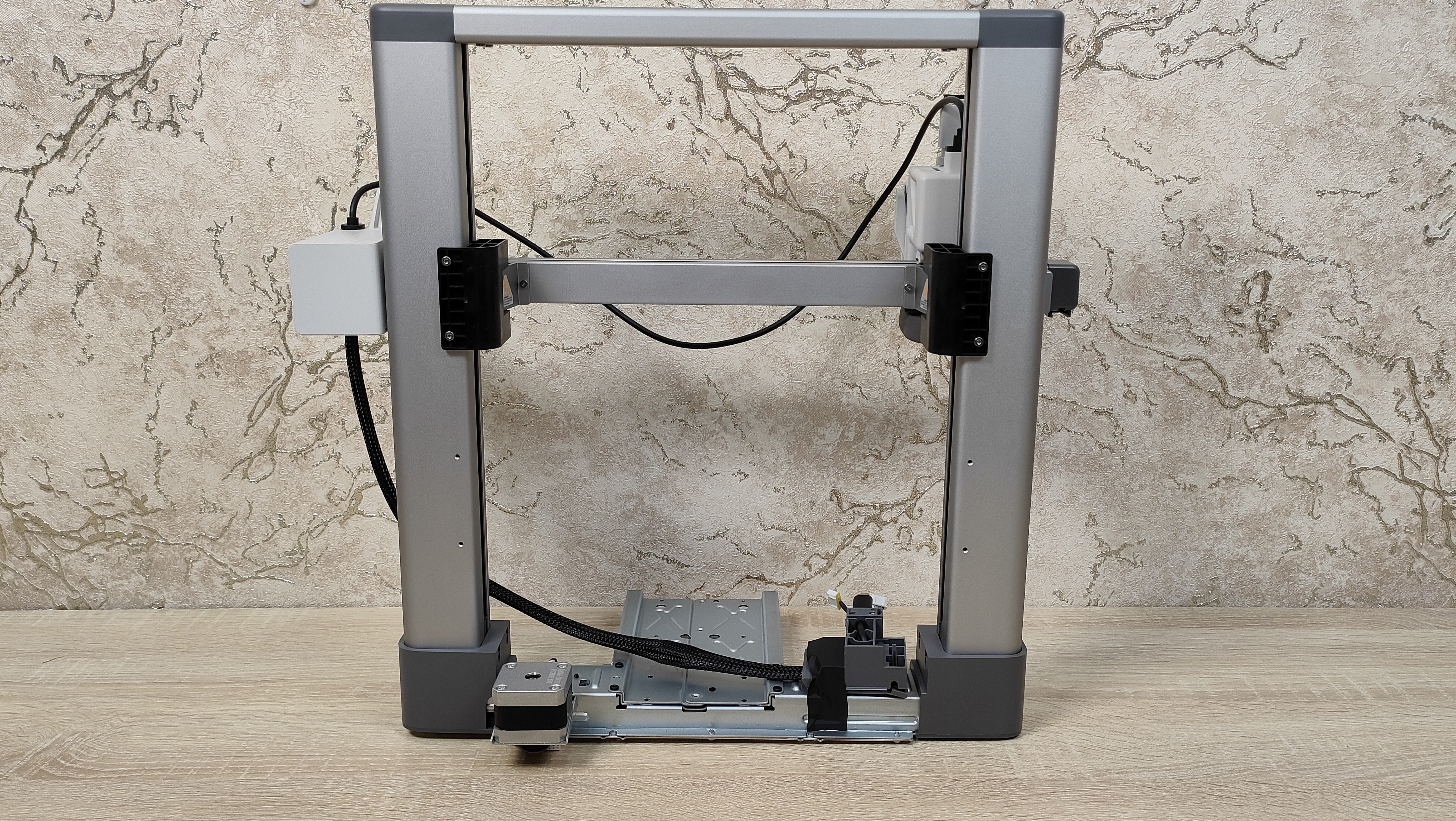 Первым делом, необходимо собрать принтер и для этого есть руководство пользователя, которое проиллюстрировано, соответственно, понятно практически любому человеку и можно смело приступать к сборке. По сути, есть всего два элемента, которые необходимо соединить, это рамка с экструдером и осями XZ, а также основание с осью Y и столом.