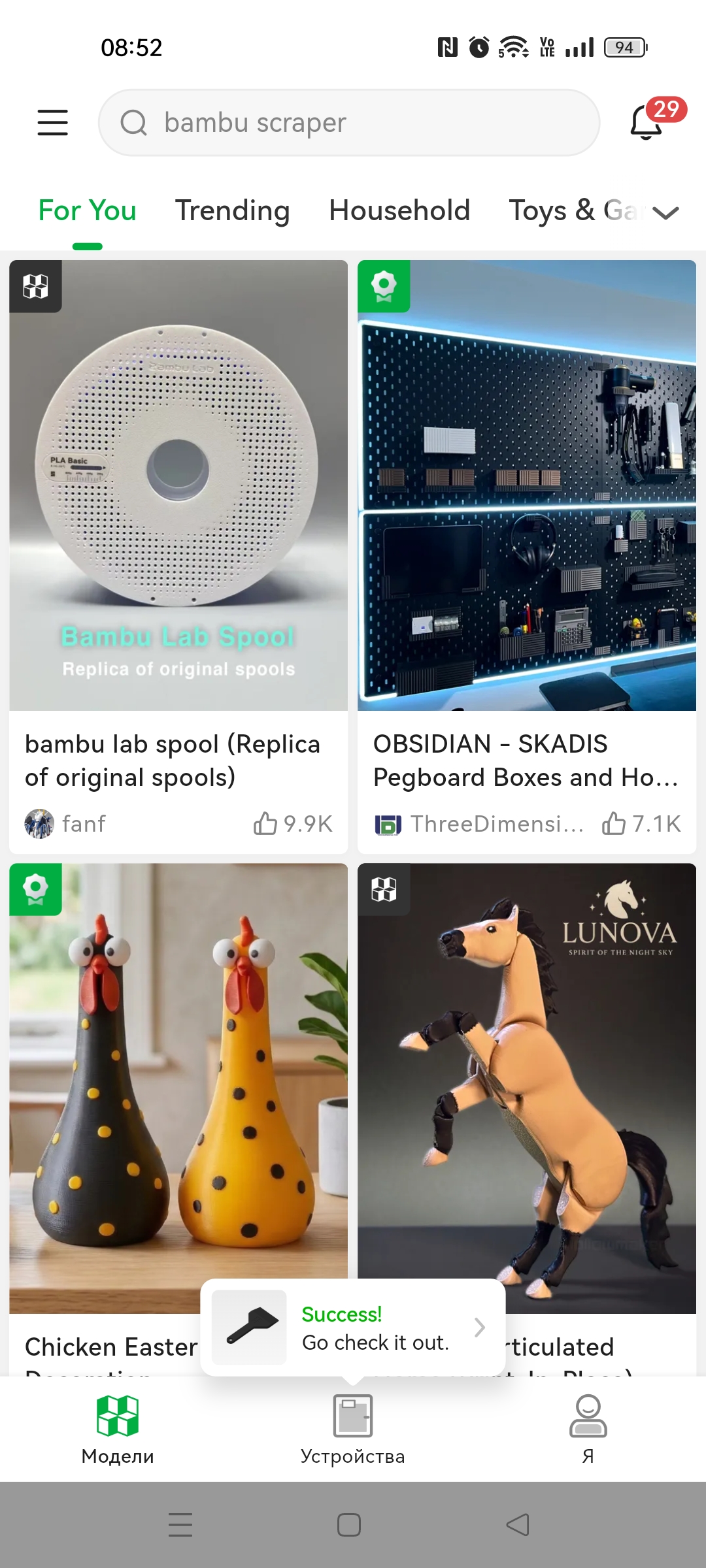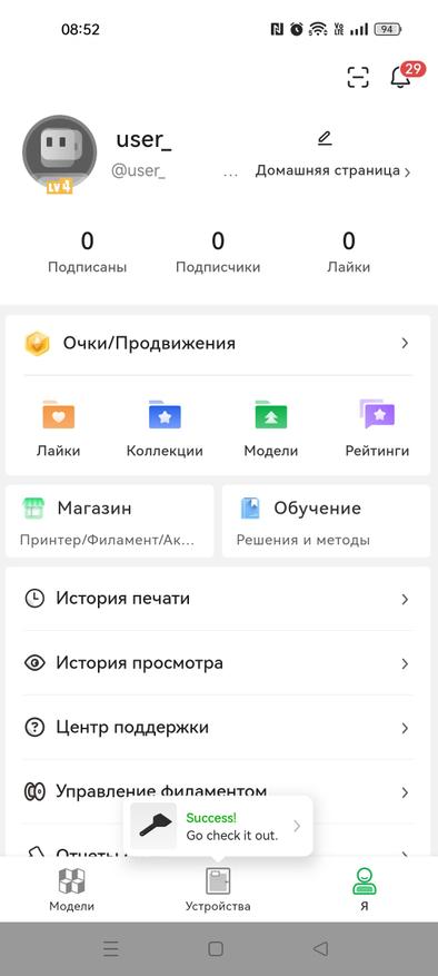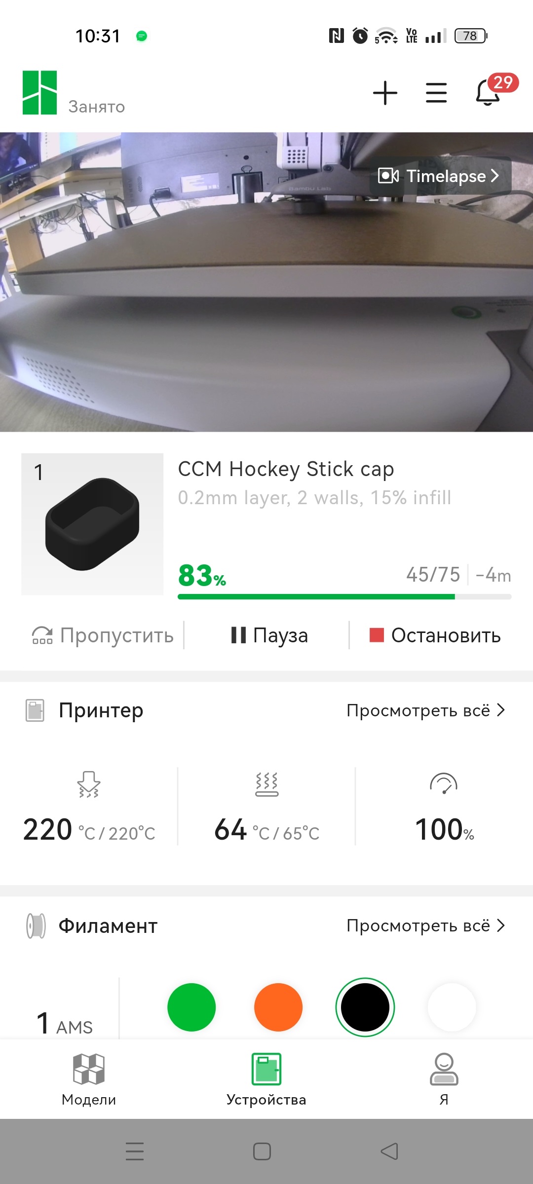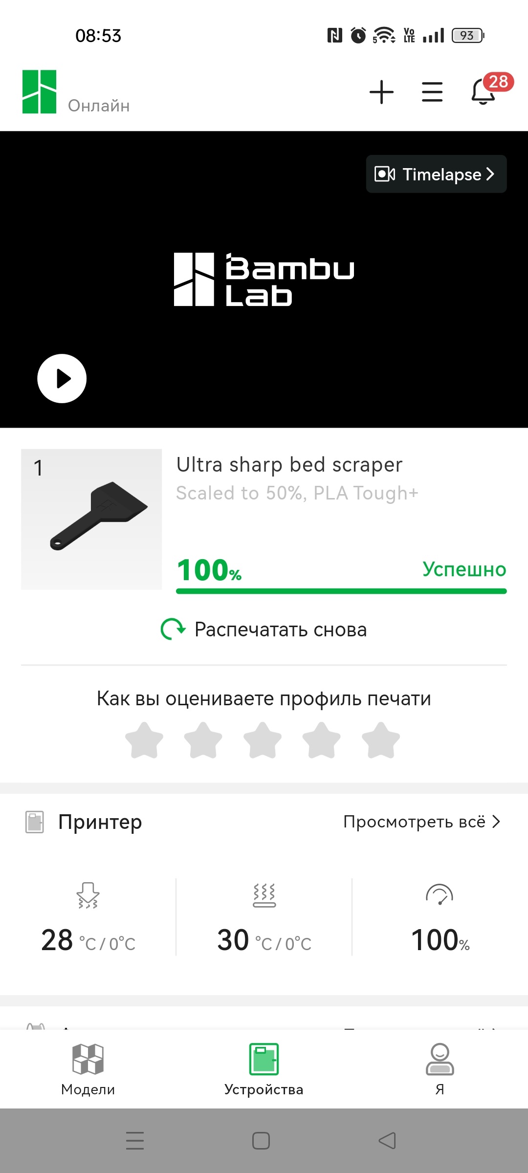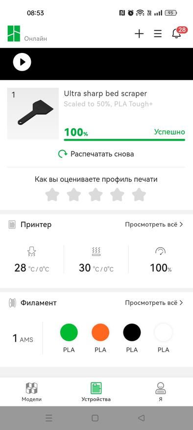 Но какое современное устройство обходится без мобильного приложения? Никакое, поэтому, можно скачать Bambu Handy и следить за работой принтера вне рабочего места. Впрочем, начать работу тоже можно непосредственно с приложения, например, наткнувшись на интересную модельку, можно отправить ее на печать и следить за ходом ее выполнения, а в случае проблем, прервать печать.