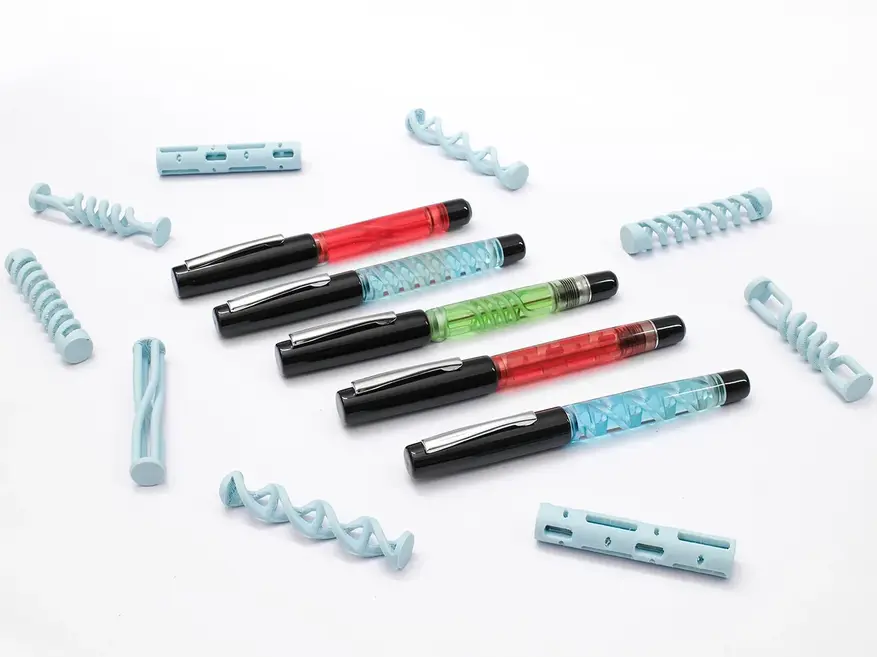 Конструкция ручки превращает её внутренний механизм в основной элемент дизайна. Для создания сложных геометрических узоров внутри корпуса — DNA, Morse, Twist, Coil и Swirl — применяется технология стереолитографии (SLA), или 3D-печать из фотополимерной смолы. Этот метод позволяет изготавливать детализированные и полые структуры без увеличения веса пишущего инструмента. Верхняя часть корпуса и грип-секция выполнены из ПММА-акрила, а основной корпус — из премиальной смолы.