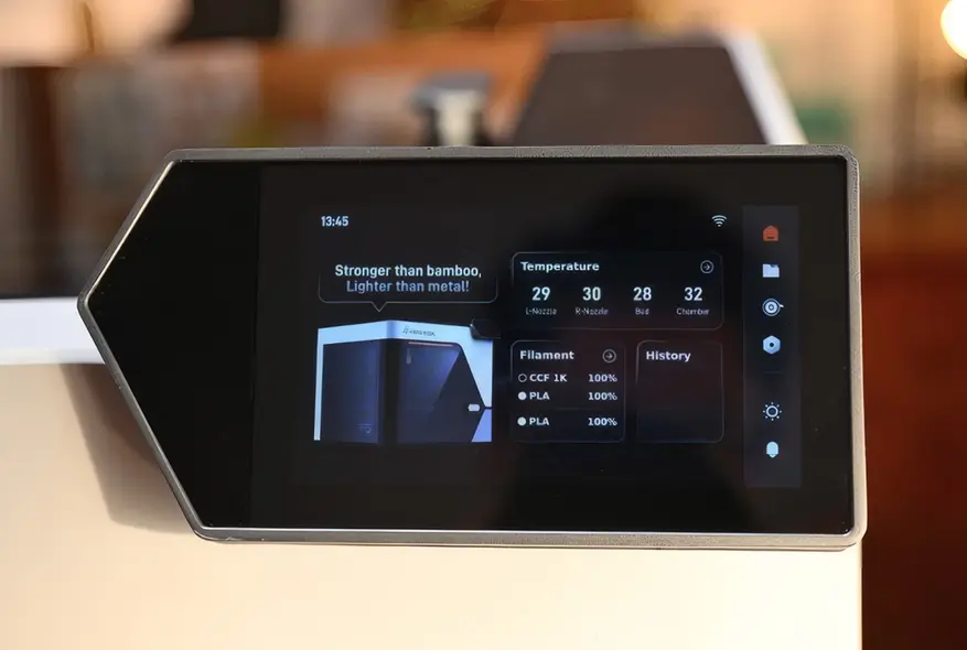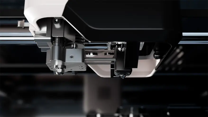 Принтер оснащён двумя экструдерами. Первый предназначен для работы со стандартными термопластичными материалами — PLA, PETG и ABS. Второй экструдер с соплом диаметром 0,7 мм обрабатывает непрерывное углеродное волокно при температуре 350°C. Такая конструкция позволяет создавать композитные детали, где пластик выступает связующим веществом для волоконного каркаса.