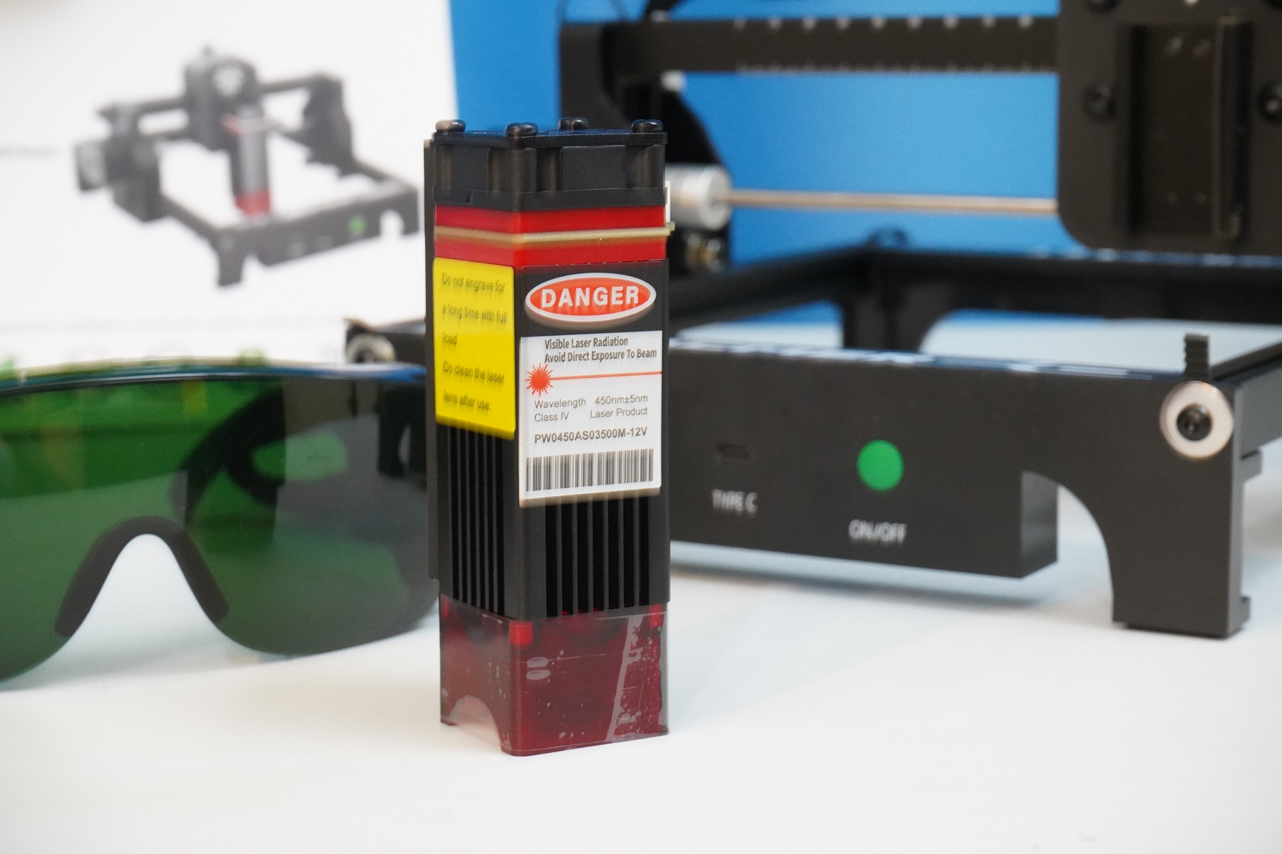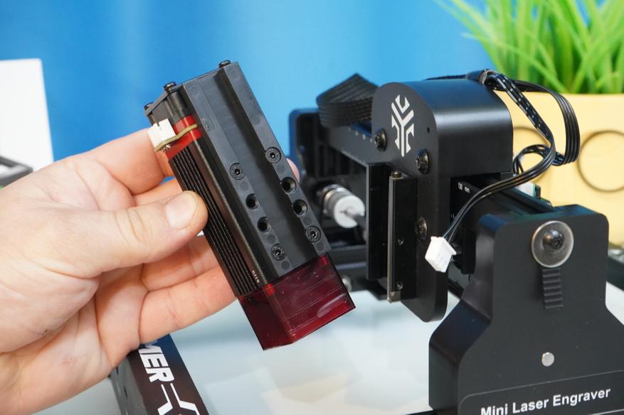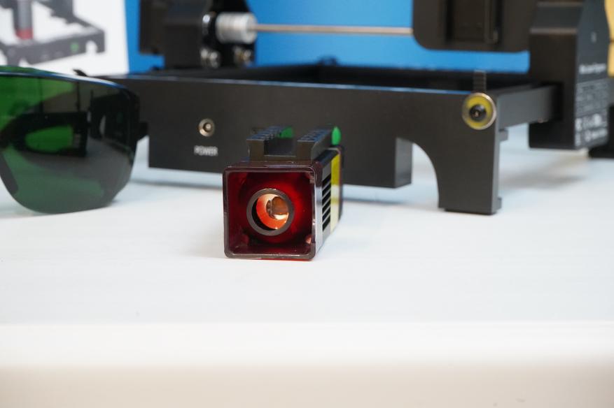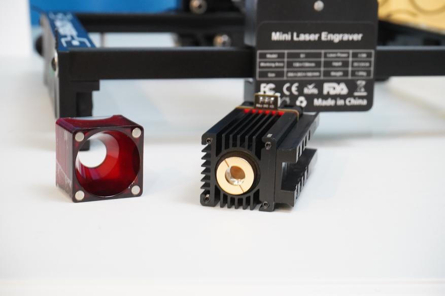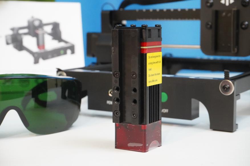 Лазерный модуль из комплекта оснащается массивным радиатором, схемой питания (управление по TTL), а также съемным защитным стеклом на магнитах. Установка происходит с помощью пластиковых салазок. Эти же салазки позволяют относительно быстро выставить высоту (и фокусное расстояние) для работы по разным материалам, вернее, по материалам с разной толщиной.