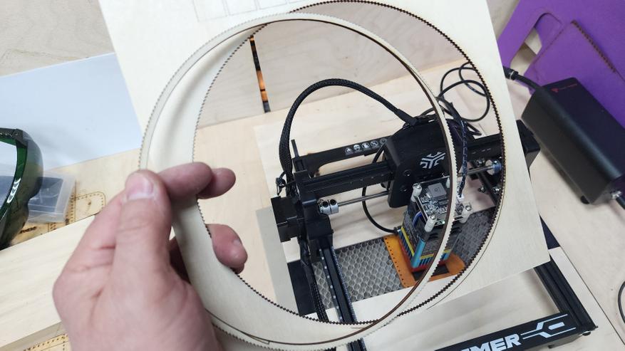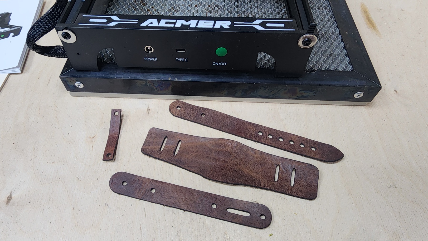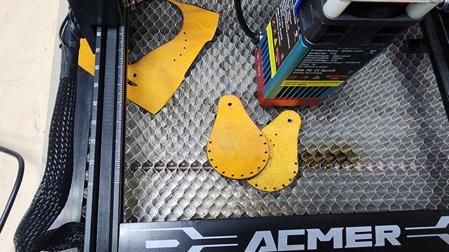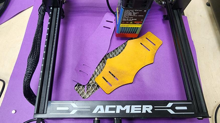 С помощью такого лазерного гравера удобно резать шаблоны и лекала. В данном случае — шаблон для изготовления часового ремешка. К слову, после замены лазерной головы на более мощную можно резать и натуральную кожу напрямую, без лекал или шаблонов. Но об этом чуть ниже. Также раскрою поддаются тонкие синтетические материалы — фоамиран, фетр, тонкие пластики, пенокартон и прочее.