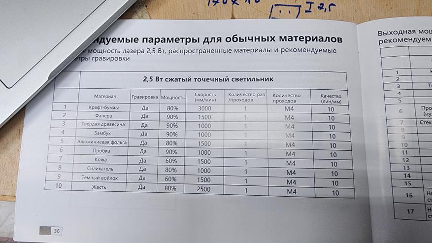 Удобная таблица с параметрами скорость/мощность для гравировки приводится в таблице инструкции. Для модели на 2.5 Вт только гравировка, для модели на 3.5 Вт еще и параметры резки. Весьма удобно, можно ориентироваться при первичной настройки. Конечно, плотность и качество материалов ваших заготовок может отличаться, поэтому не забывайте проверять и пользоваться паузой.