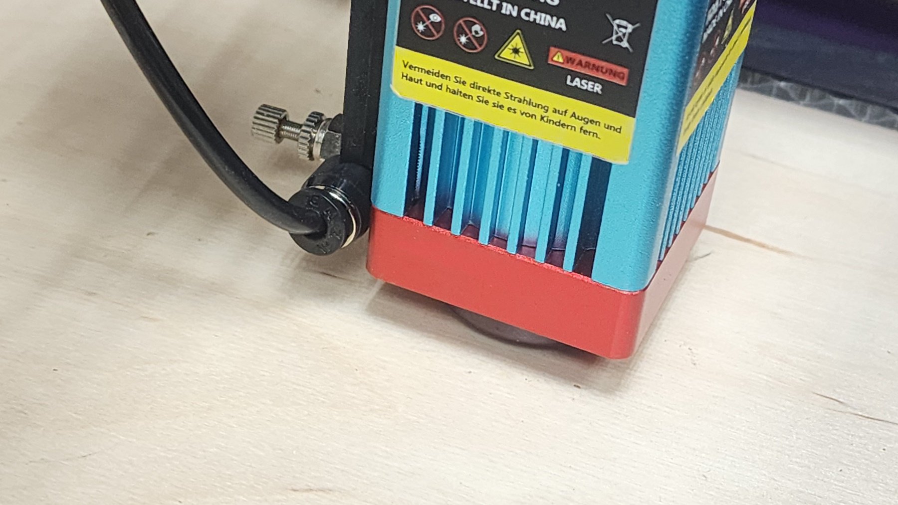 Следующий шаг, который просто напрашивается при замене «головы» — это подача сжатого воздуха в модуль. Необходимость такого решения вполне понятна — из зоны сопла удаляется дым, остатки материалов, избыточное давление защищает линзу от копоти и агрессивных испарений. Да и сам процесс резки происходит лучше — чище торцы, нет эффекта «ожога» от рассеивания луча. Фитинг в сопло, тонкая и эластичная трубка от аквариума, насос-компрессор — вот простой рецепт доработки. По опыту достаточно 2-3 бара (я ставлю 2.5 бара на редукторе).