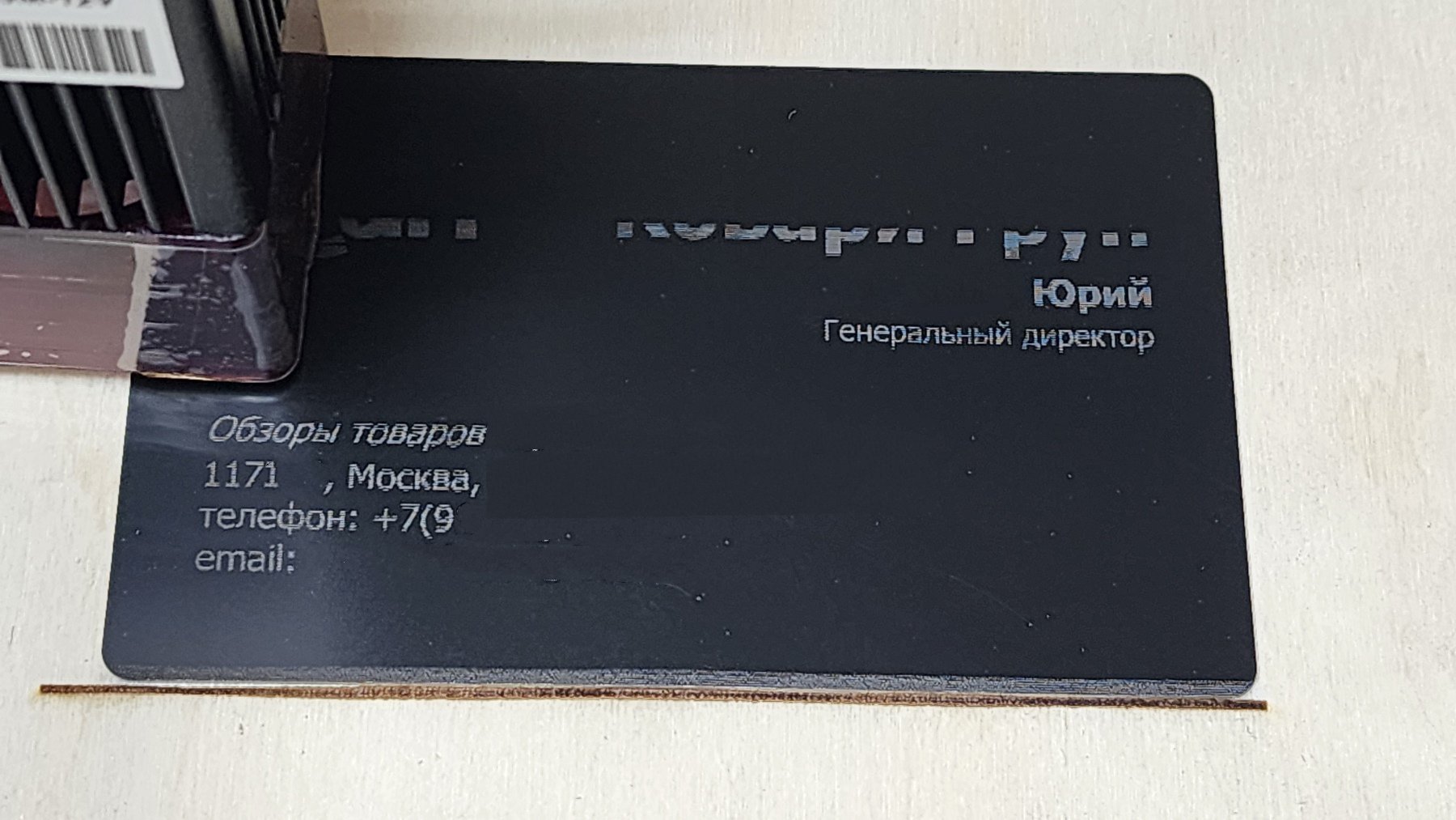 Попробовал новое для себя решение — алюминиевый визитки. Покупаются заготовки (тонкий алюминиевый лист в формате кредитной карточки, покрытый краской). Выполнять гравировку можно как позитивным способом, так и негативным. То есть у вас либо буквы будут алюминиевые, либо лазер удаляет всю краску вокруг букв. Необычно, нужно будет проработать дизайн визитки специально под такой вариант.