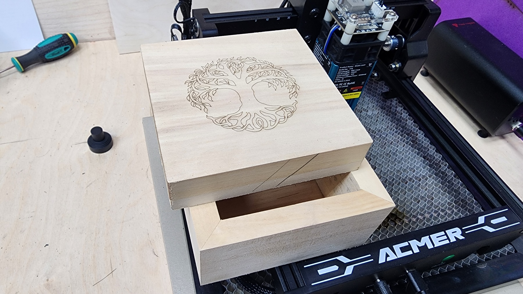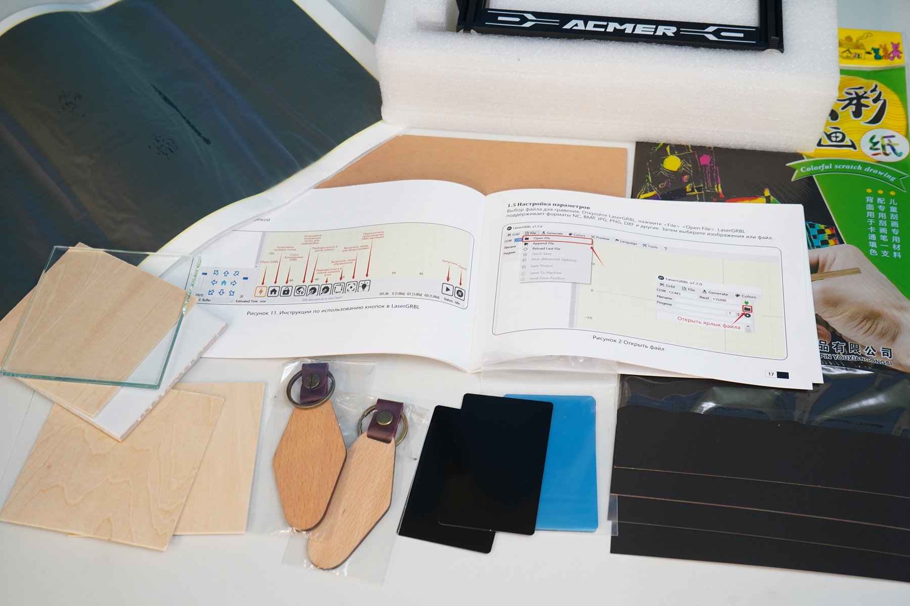 Купить лазерный гравер и аксессуары можно в магазине Acmer. В частности, в планах купить вот такой защитный короб для вытяжки/удаления дыма при работе. Драйверы и программы смотрите на официальном сайте.