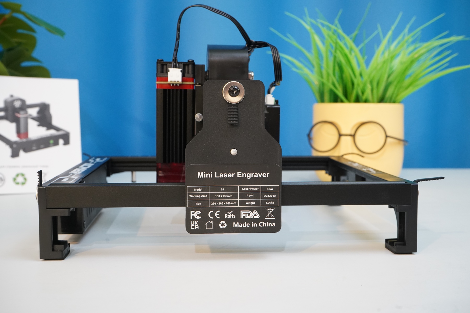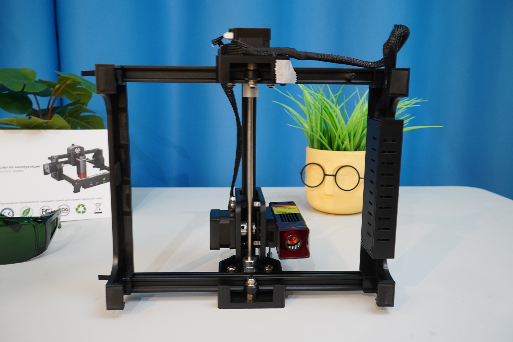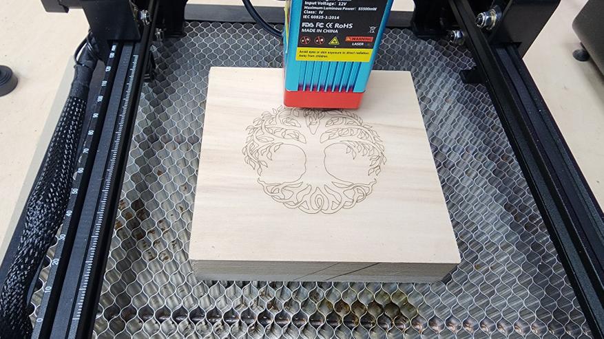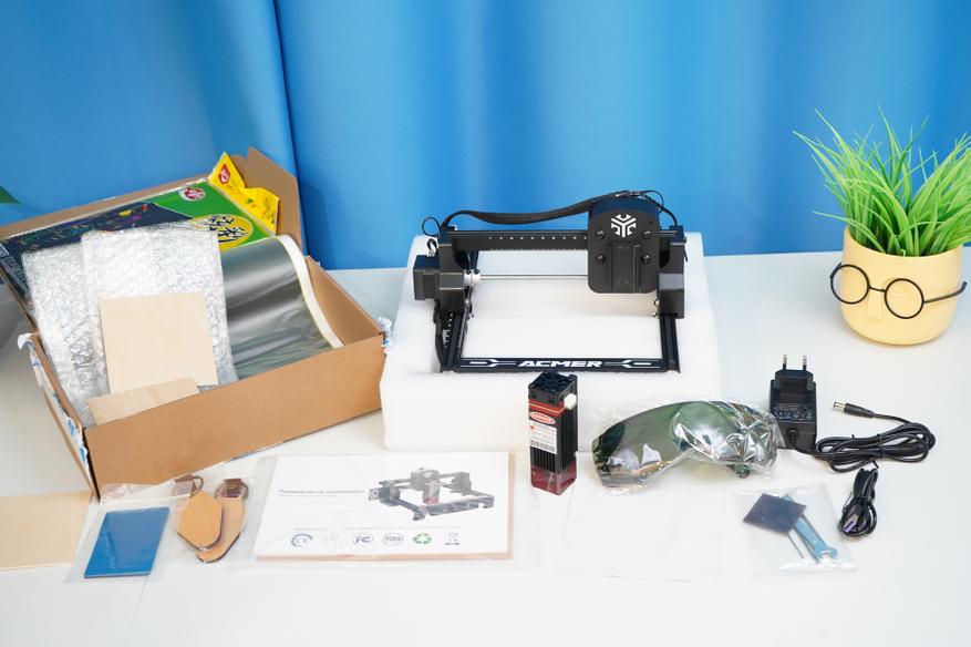 Данную модель выбрал именно из-за её доступности — низкая цена, простой уровень вхождения в гравировку, понятная инструкция с описанием режимов работы (резка/гравировка), оптимальные размеры для работы дома на столе. Мощности хотелось бы чуть больше, но уже 2.5 Ватта хватает не только для выжигания на поверхности, но и для раскроя ряда материалов. У меня в комплекте был набор расходников для теста, защитные очки, блок питания, калибровочная пластина и регулировочные ключи.