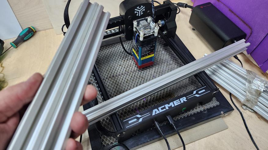Ну и напоследок. Этот лазерный гравер можно рассматривать как конструктор, то есть — как базу для будущего апгрейда. Найти аналогичный алюминиевый (конструкционный) профиль не составляет проблемы. Пара отрезков профиля 2020 сделают его длинным и способным гравировать, например, на вытянутых шкатулках, на разделочных досках и так далее. А еще пара отрезков сделают гравер шире. Для увеличения по длине нужно будет заменить ремень (GT2-6mm, подойдет отрезок в пару метров), а по ширине — заменить 6-миллиметровый полированный вал на аналогичный нужной длины. Найти такой вал можно в старом принтере или сканере или же заказать по размеру на маркетплейсе. В приложении для гравировки прописываются новые размеры и можно работать!