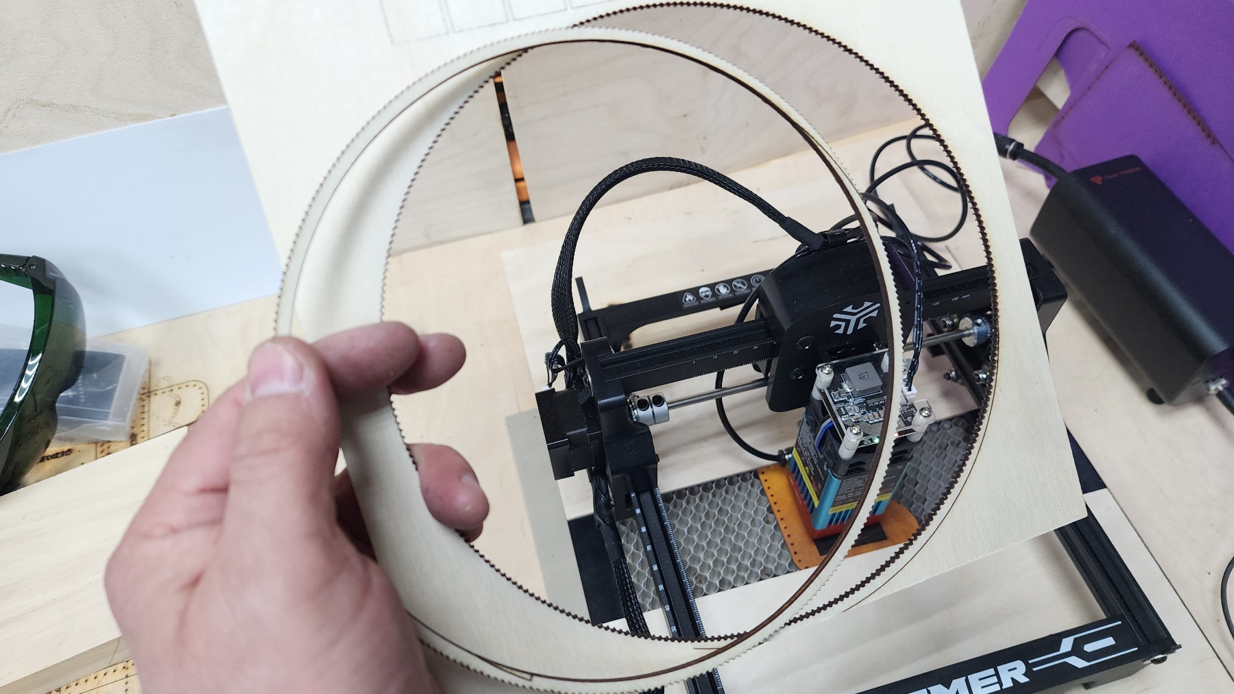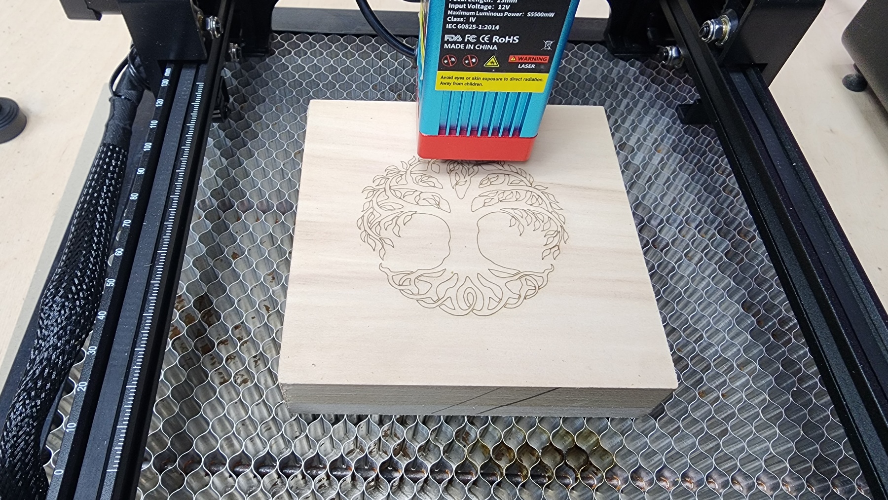 Тест выжигания по фанере. Очень желательно выбирать ровную фанеру без перегибов, так как от фанеры «винтом» можно получить нестабильный результат. На большие листы устанавливаю корпус гравера целиком, а маленькие листы можно закрепить с помощью магнитов.