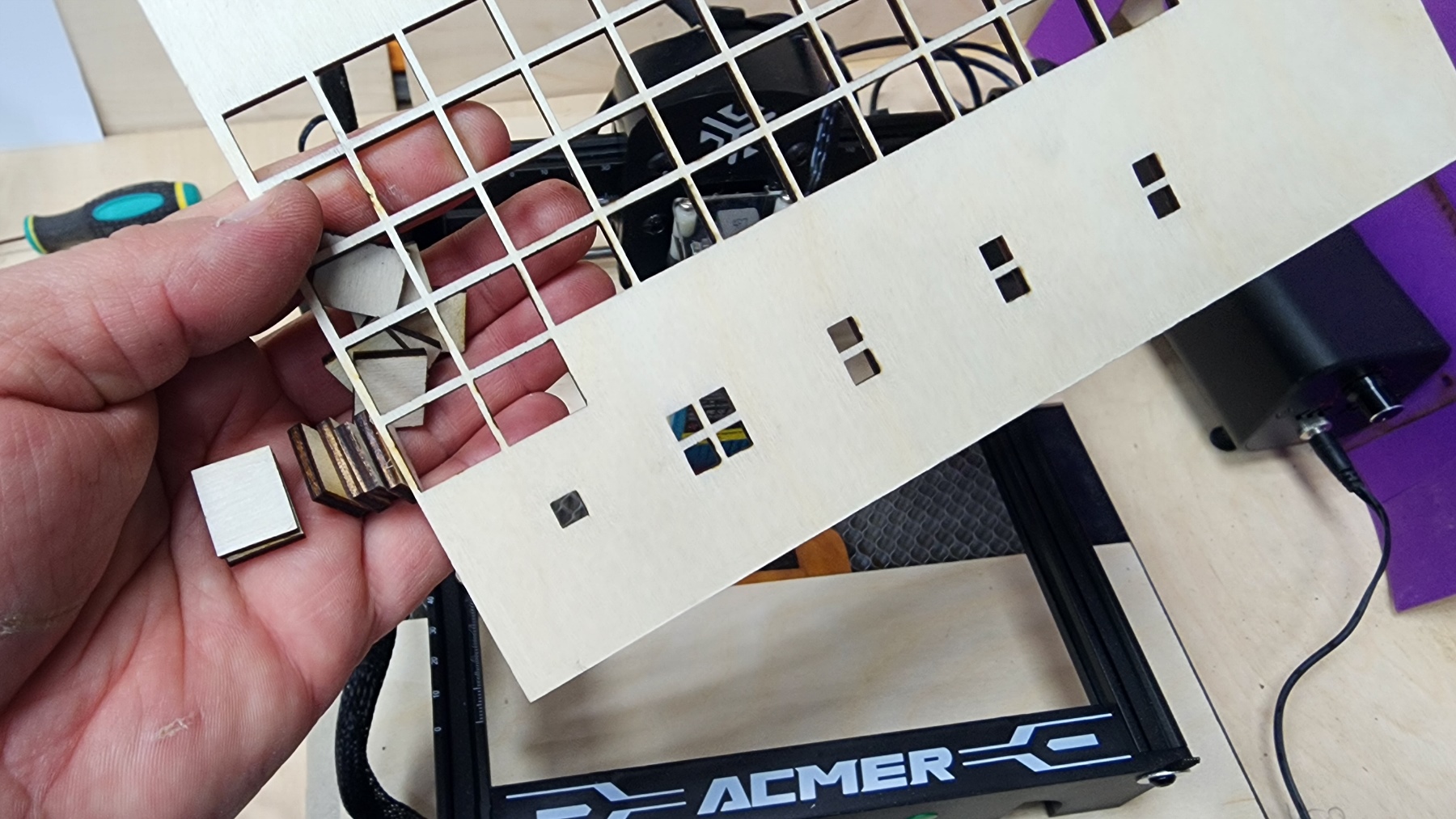 Первое, что попробовал — это тест на возможность резки. Стоковая «голова» позволяет не только наносить гравировку, в том числе и рельефную/фактурную (пара предпоследних нижних рядов), но и прожигать фанеру насквозь. На фото фанера 3 мм. Очень нужен воздух в зоне реза — тогда не будет вот таких прижогов и обугленных краёв. Но в целом неплохо, то есть мощности вполне хватает. Надо будет подумать, как исправить ситуацию с воздухом с минимальным вмешательством.