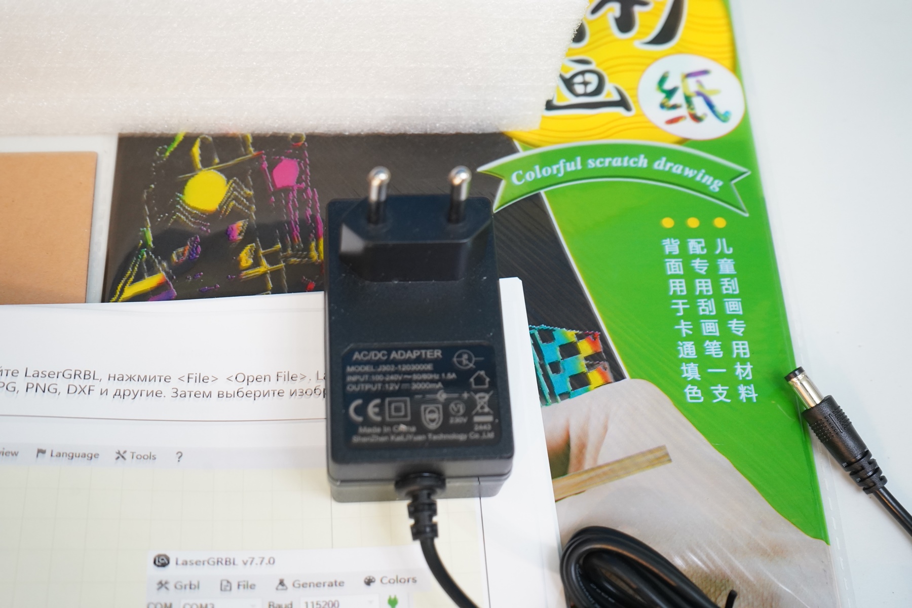Штатное питание с евровилкой, 12 Вольт и 2 Ампера. В данном случае этого хватает, но при апгрейде нужно будет заменить. Штекер для питания гравера типовой, DC5525, подобрать что-то на замену не составит труда. Как я уже сказал, в комплекте был набор расходных материалов для первых проб и ошибок в гравировке, а также подробная инструкция. К слову, есть необычные материалы, такие как алюминиевые визитки и тонирующая пленка для гравировки на стекле.