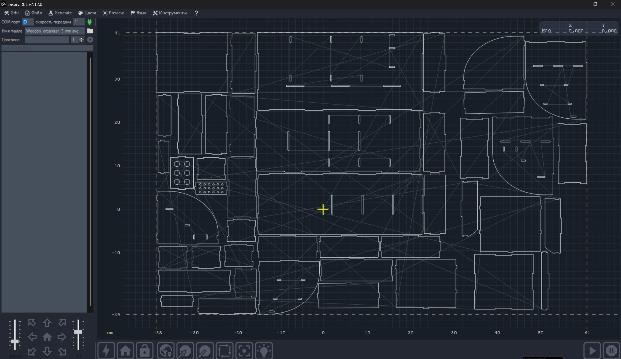 То, что нужно сделать при первом подключении — это добавить профиль станка (для LightBurn), указать порт подключения (могут понадобиться драйверы для виртуального COM-порта). Ну и скорость перемещения головки, а также её мощность. Обратите внимание, скорость перемещения можно указывать как в мм в минуту, так и в мм в секунду. Весьма часто путают эти параметры. Например, скорость реза 200 мм/мин будет соответствовать 3.3 мм/сек. Обращайте на это внимание, хотя бы в первое время использования станка.