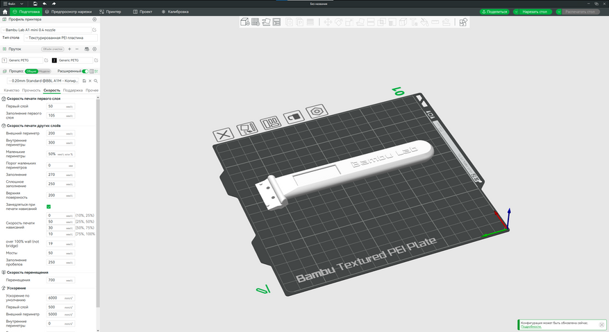 Все файлы нарезались в слайсере производителя. Параметры скорости смотрите на скриншоте. Это рекомендуемые скорости, можно поставить и больше, но смысла особо не вижу. Все настройки подобраны идеально. Поэтому этот принтер создан для тех, кто хочет просто нажать «печать» и получить на выходе качественную деталь. Сопло установлено 0.4, высота слоя — 0.2 мм.