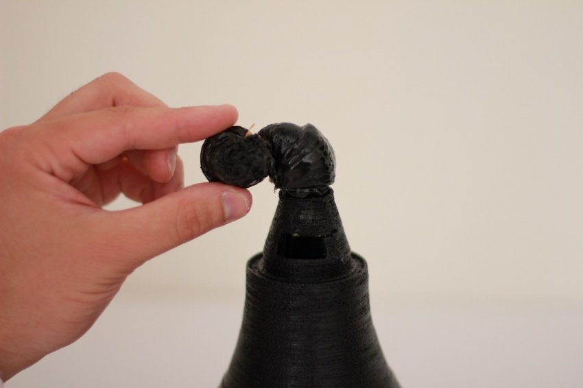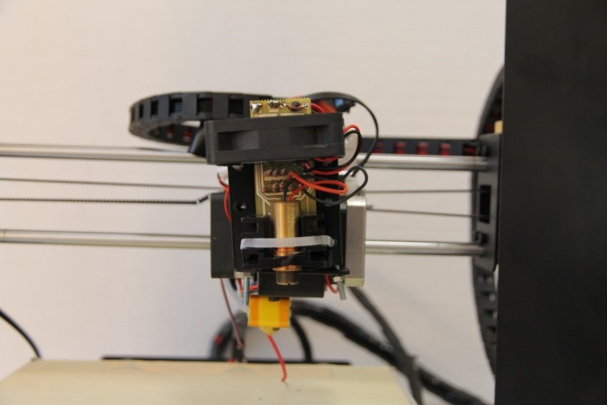 Часто приходится разбирать голову принтера, откручивая экструдер и прочищать забитое сопло. Однажды просто отпаялся провод для поддержания рабочей температуры стола, который никогда не находился в состоянии натяжения… ну и потом пластик просто уже не прилипал. Припаяли. Вопрос с адгезией снова пришлось решать самостоятельно аэрозольным лаком с содержанием полиакриловой смолы, пластификатора и углеводородного пропилена. Когда же все шло хорошо и деталь почти была закончена – случилось это… Сгорел вентилятор охлаждающий, выходящий из сопла, пластик.