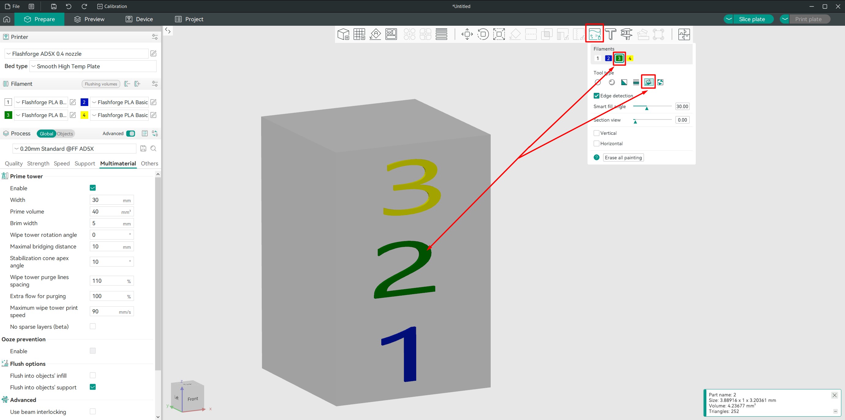 Чтобы подготовить модель для многоцветной печати, достаточно добавить дополнительные катушки и нажать на иконку с холстом. Инструментов тут не очень много, но достаточно для того, чтобы окрасить элементы, которые выделяются на поверхности детали. В данном случае использовал заливку.