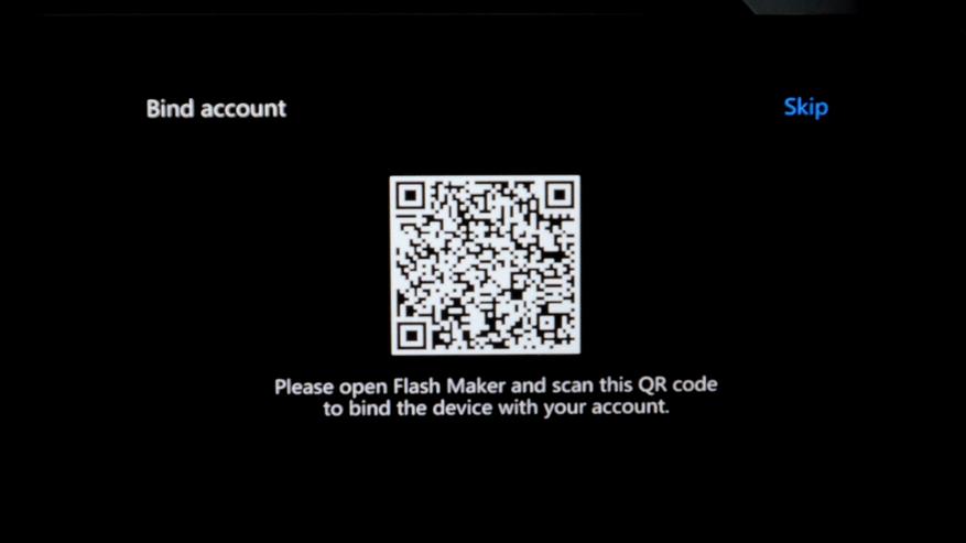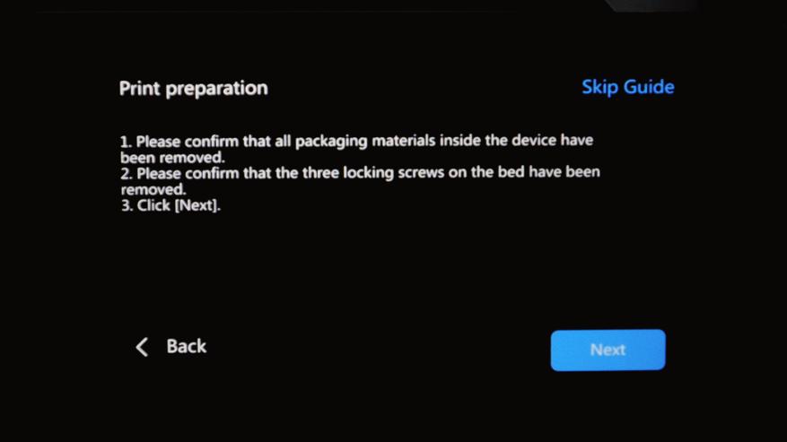 Система предложит выбрать язык интерфейса. Русский имеется, но часть нового текста не переведена. Далее появится напоминание о транспортировочных винтах стола. На третьем шаге можно подключиться к домашней беспроводной сети и войти в аккаунт FlashForge, чтобы получить возможность контролировать принтер удаленно с помощью ПК или мобильного телефона. Проще всего осуществлять привязку с помощью мобильного приложения Flash Maker.
