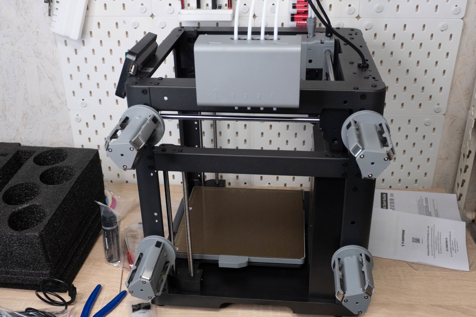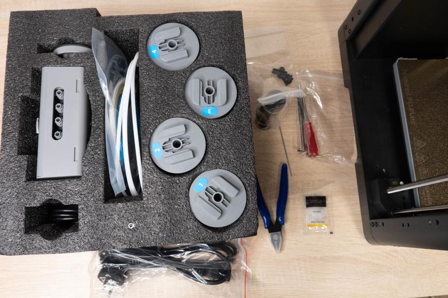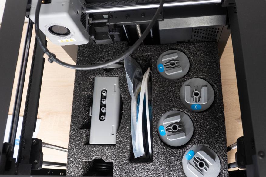 Чтобы извлечь внутреннюю защитную конструкцию, нужно сначала убрать небольшой кусочек вспененного материала за кареткой, сдвинуть её до упора назад и можно вытаскивать всё через верх. Помимо стандартного набора, состоящего из смазки, клея, кусачек и отверток, у этой модели имеется еще и блок IFS для автоматической смены филамента(аналог AMS).