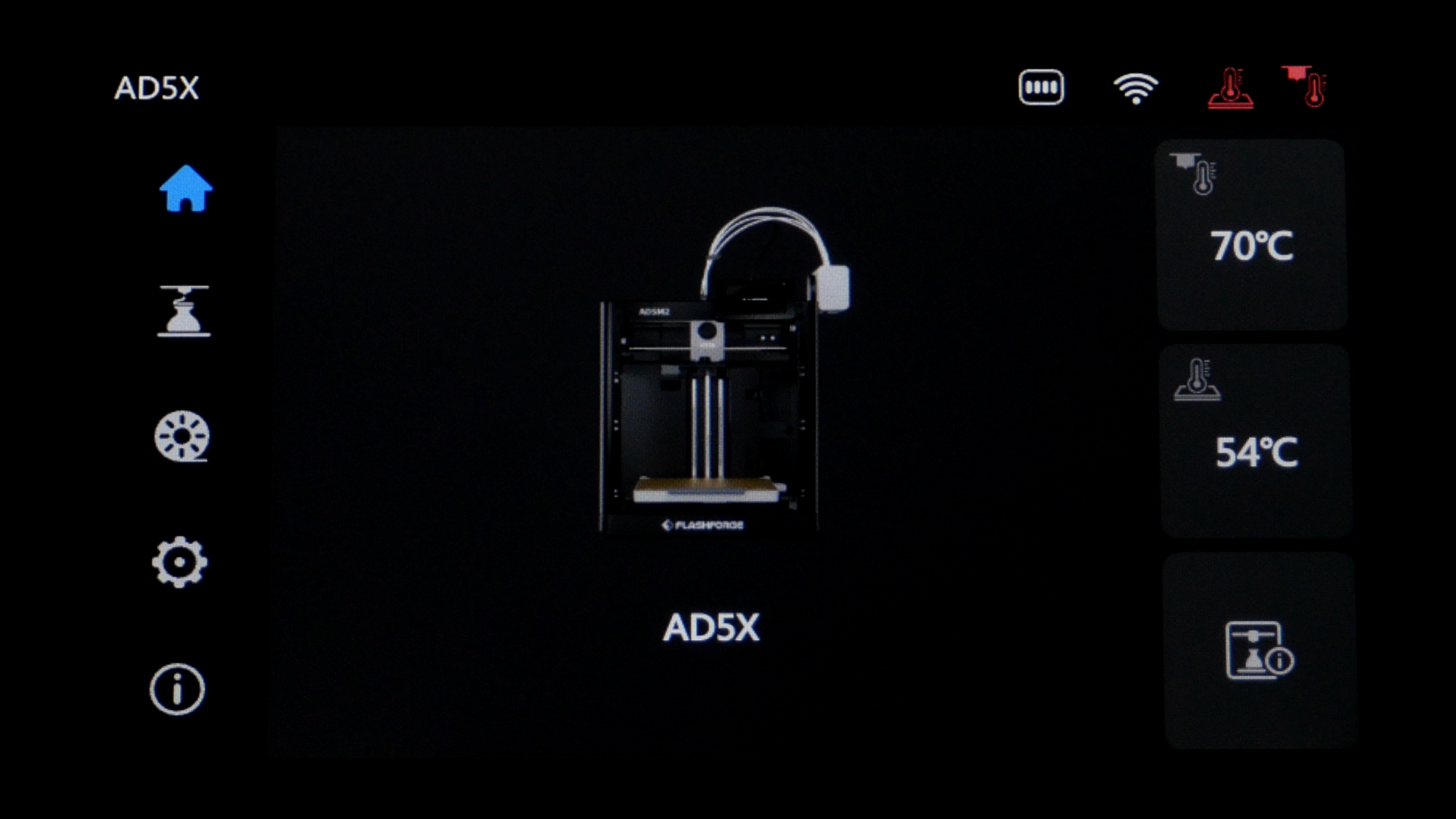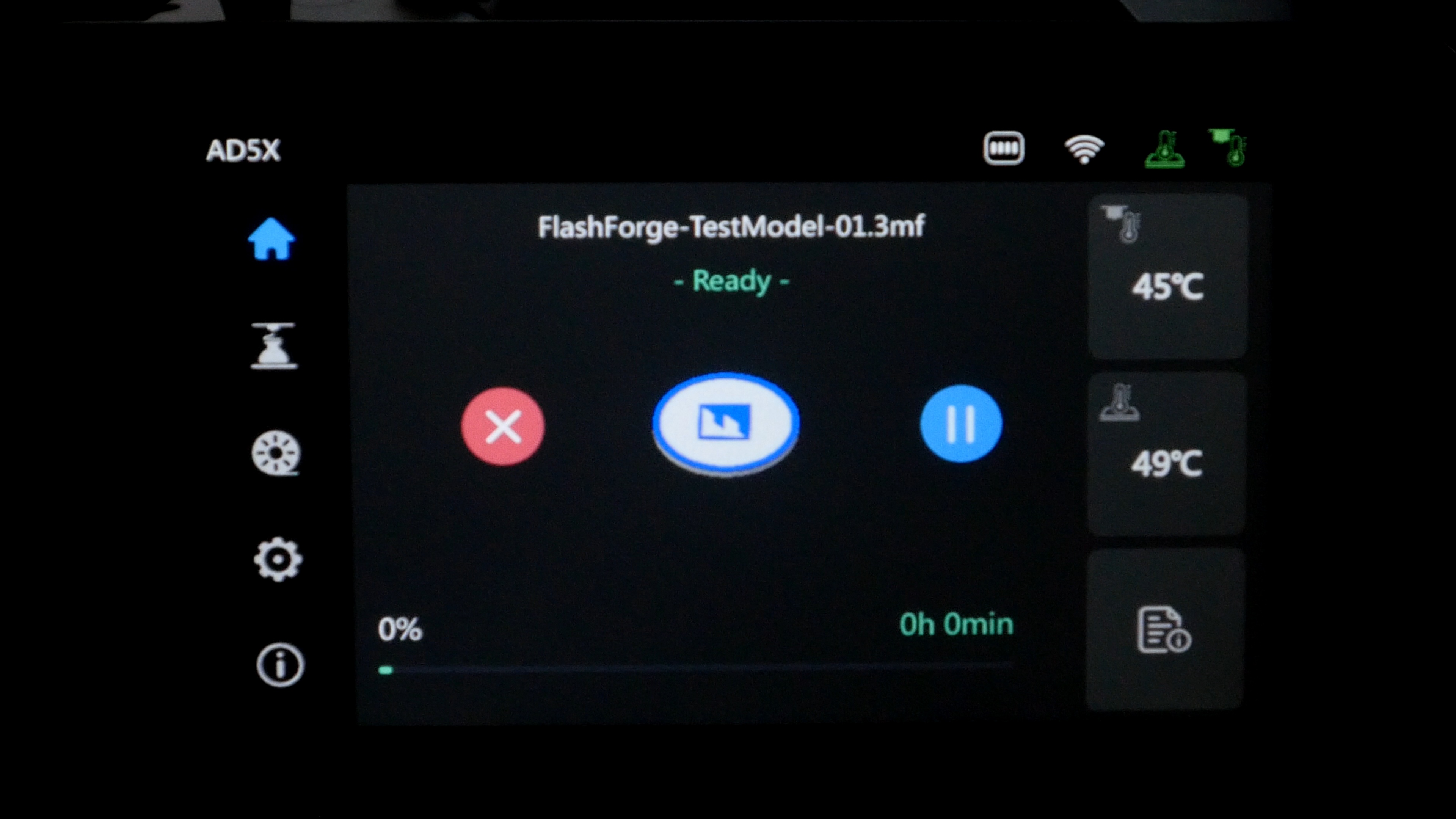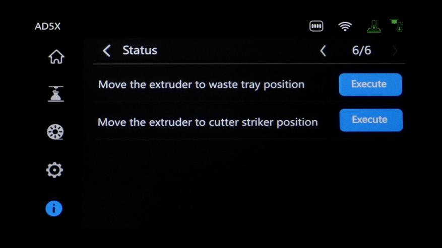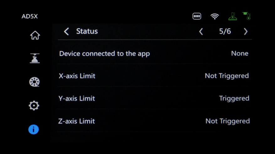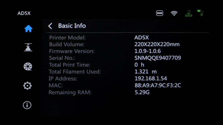 После печати появляется основное меню. В первой вкладке отображается текущий статус, температура сопла и стола с возможностью регулировки после нажатия на нужную иконку. Кнопка в правом нижнем углу открывает окно подробной информации о принтере. Тут есть версия прошивки, серийный номер, пробег экструдера, а так же IP и MAC адреса для подключения по сети.