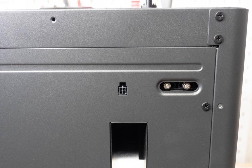 Обязательно открутите транспортировочные винты стола, иначе во время начальной настройки принтер будет громко трещать и ругаться. Их всего три штуки и они отмечены зелеными стрелками(странно, что не красными). После подготовки можно подключать кабель питания и нажать тумблер включения, который находится рядом с разъемом.