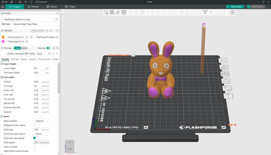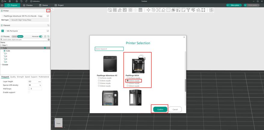 Производитель рекомендует использовать слайсер OrcaFlashforge, который является модификацией OrcaSlicer, но включает в себя дополнительные профили прутка и печати, а так же возможность отправлять файлы и управлять принтером удаленно, в том числе из внешней сети.