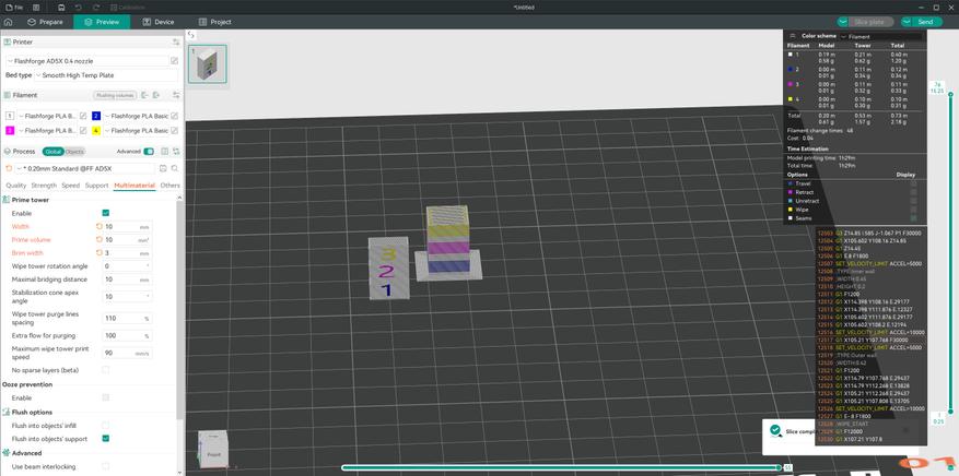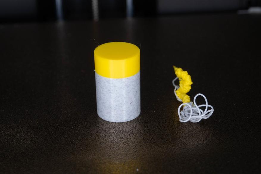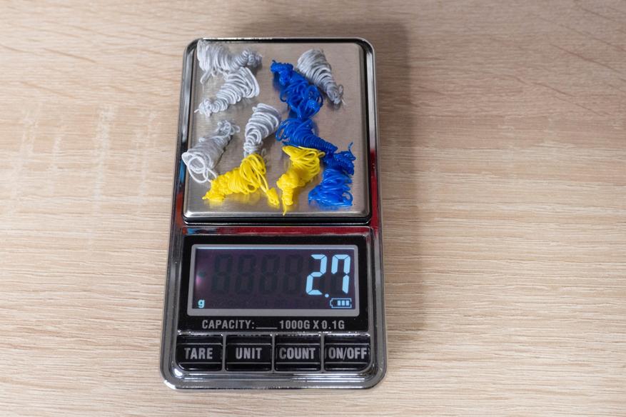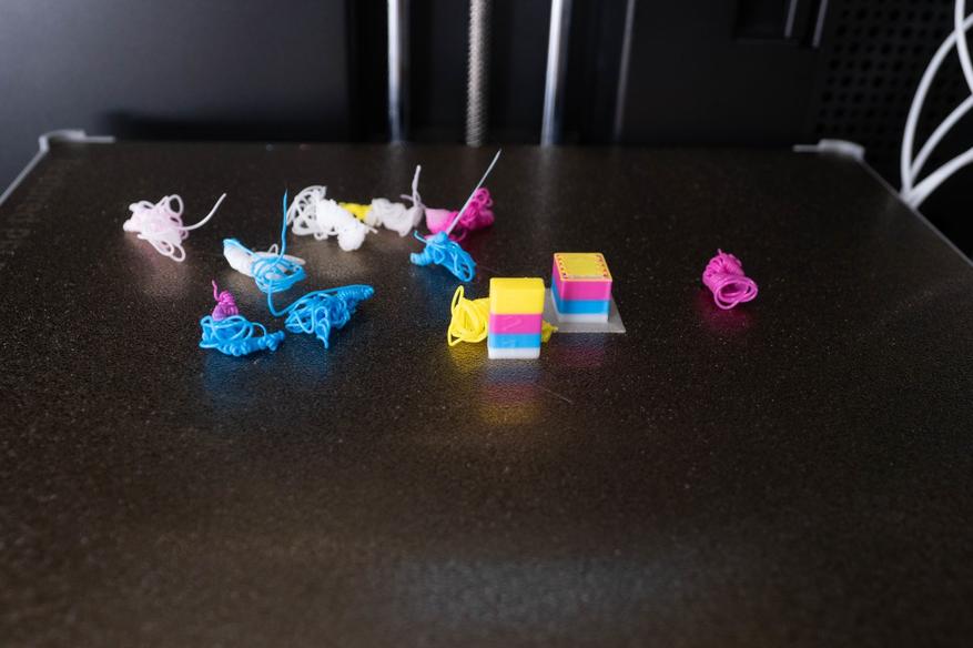 От обилия отходов поначалу возбуждается жаба, но всё не так уж плохо(около 0.5 грамм на цикл замены прутка), просто они выглядят объемно. У кого отлипали детали, знают сколько «макарон» может сгенерировать принтер за короткий промежуток времени. Хотя это конечно накладнее, чем печатать одним цветом и одиночные маленькие модельки делать расточительно.