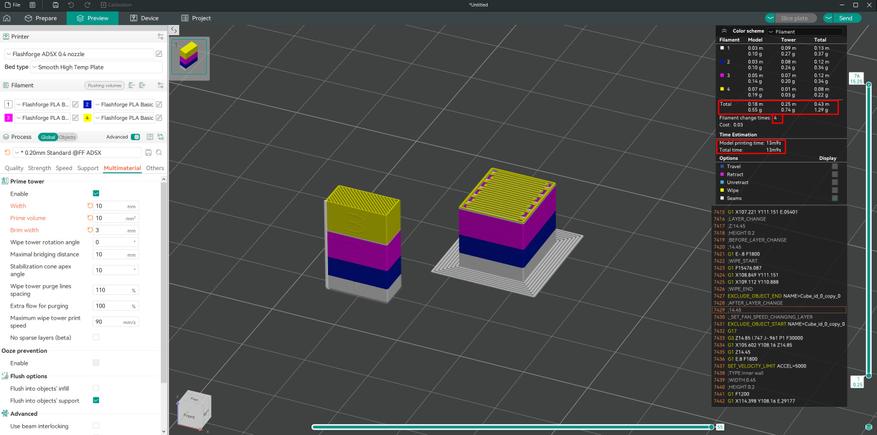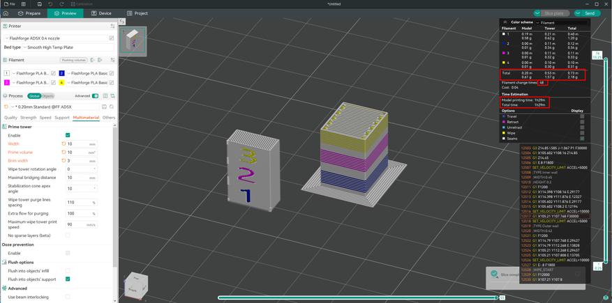 Можно подумать, что в первом случае печать будет экономичнее, но обратите внимание на показатели расхода материала, а на время печати и смотреть страшно. А еще слайсер не учитывает расход на очистку сопла.