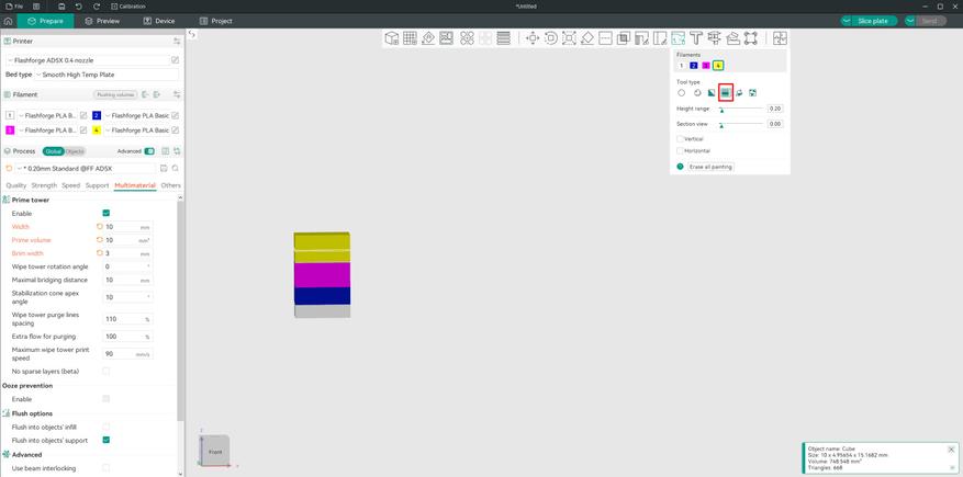 Вскоре понял, что пробников филамента мне не хватит, т.к. когда появились встроенные цветные элементы, пластик начал уходить на глазах, а кубик наращивался не очень интенсивно. Это не удивительно, учитывая, что смена происходит на каждом слое: печать периметров — очистка — несколько вставок другого цвета-очистка.