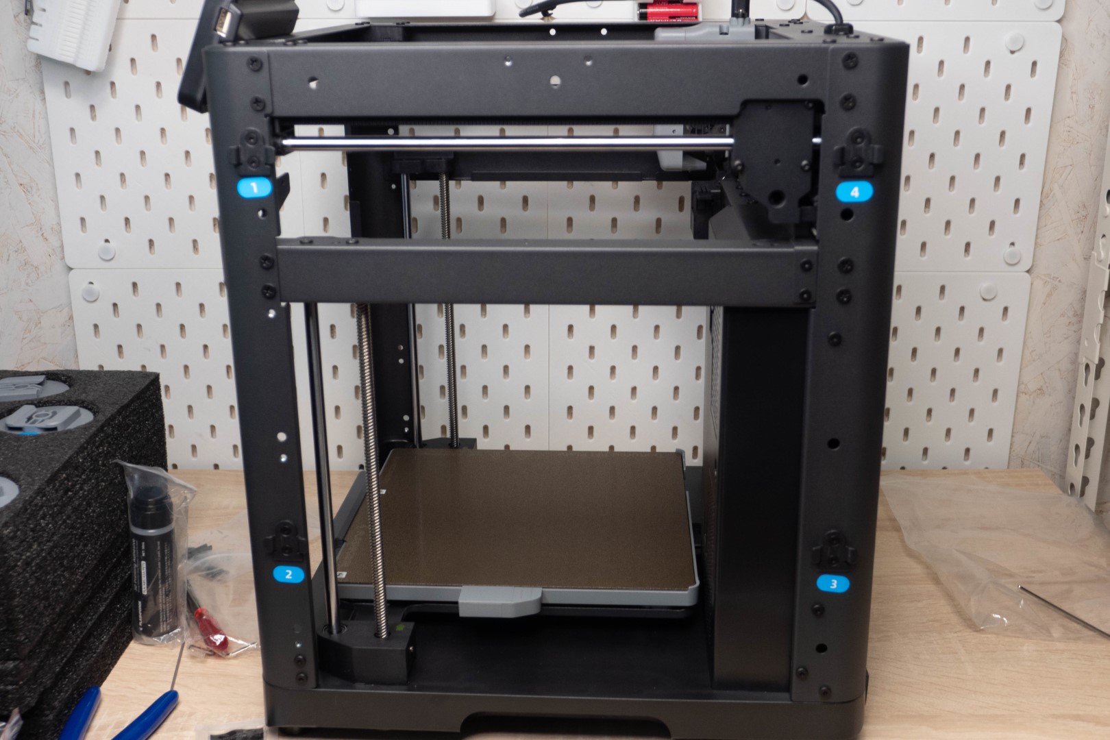 Принтер приходит в коробке из плотного картона, каркас дополнительно закрыт мягкими вставками как снаружи, так и внутри и помещен в пакет. Уголки упаковки чуть помяты, но на содержимом это никак не сказалось. Я сразу открутил экран с уголком и установил его на место не отключая шлейф.