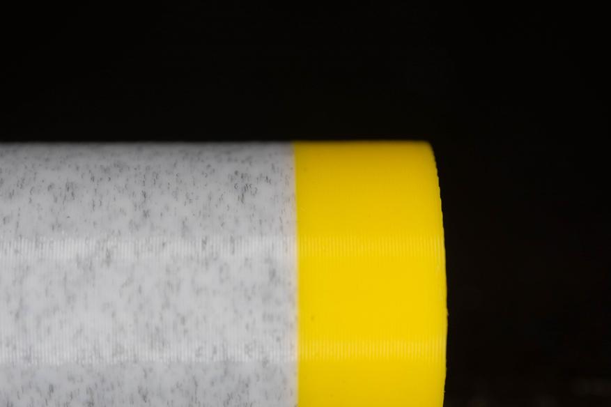 Переход тактильно не заметен, хоть и использовались немного разные типы пластиков. По отходам видно, что серый более вязкий. Если бы не разные оттенки, я бы и не подумал, что печать прерывалась.
