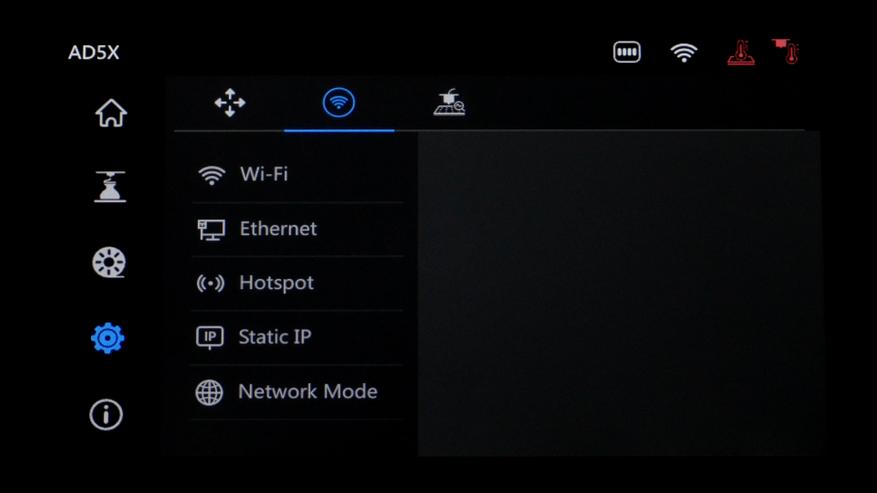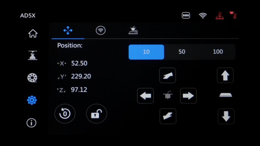 Во вкладке настроек можно подвигать оси, подключиться к сети и провести повторную калибровку.