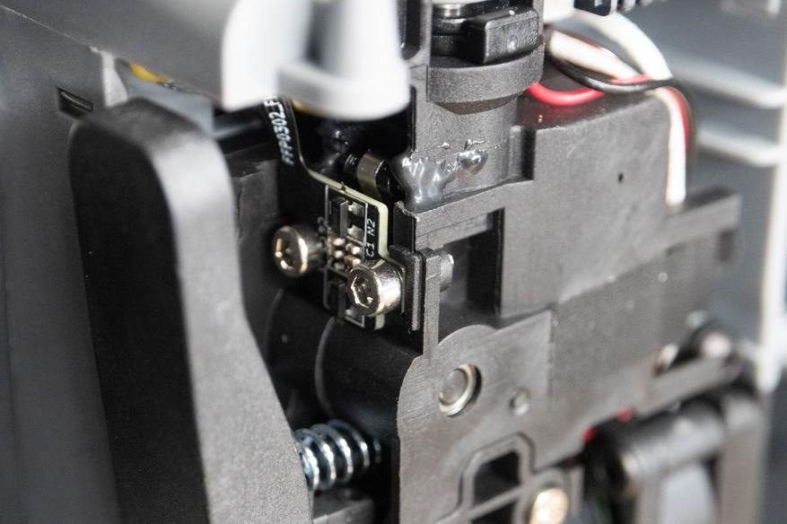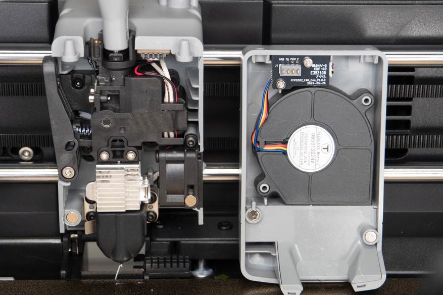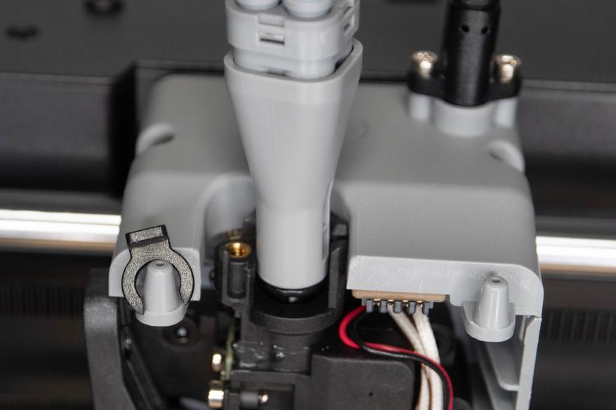 Передняя крышка печатающей головки обзавелась контактной площадкой и её можно снимать не переживая за провода вентилятора. Перед резаком добавлен датчик филамента.