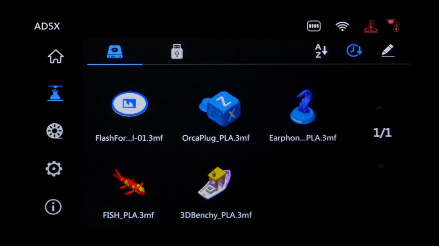 В следующей вкладке отображаются модели для печати, сохраненные во внутренней памяти, либо внешнем накопителе. Ниже находится меню смены филамента. Извлечь филамент из неактивной ячейки можно самостоятельно, его ничто не блокирует, а при вставке нового блок IFS автоматически подаст его. Останется только назначить ячейкам тип и цвет.