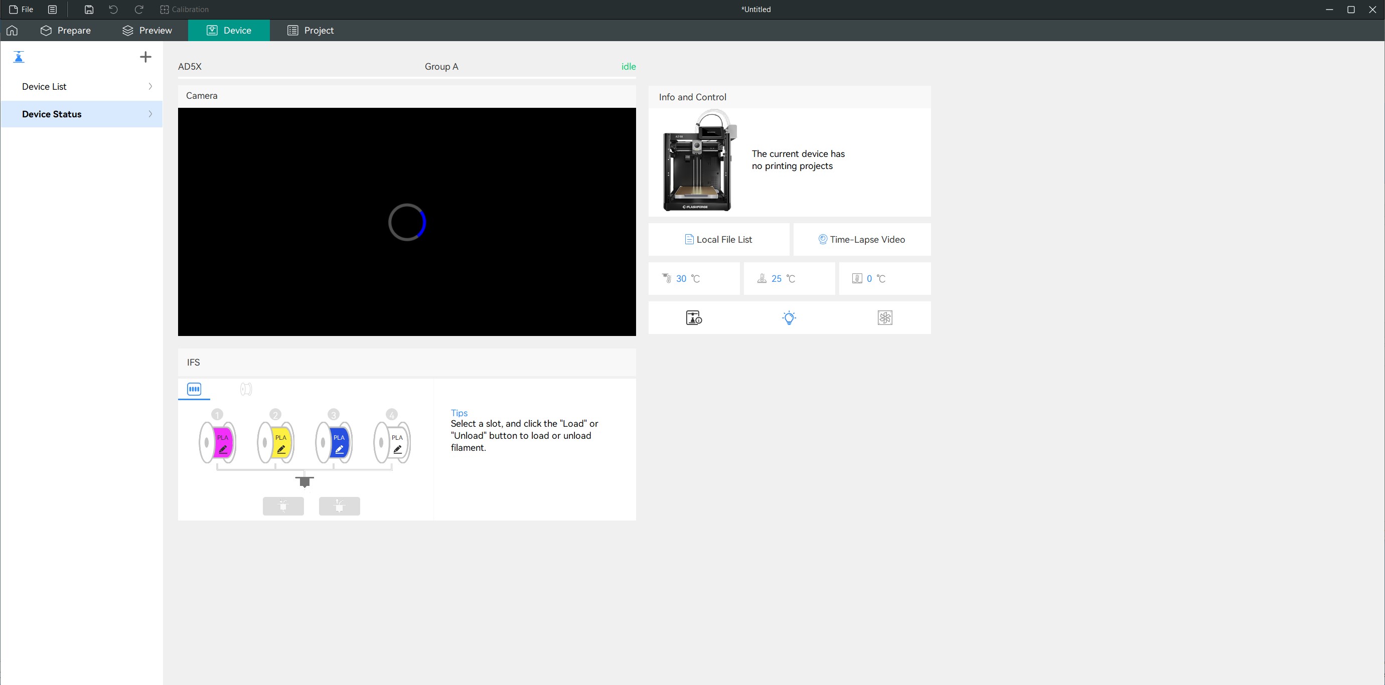 Во вкладке Device можно редактировать материалы, запускать на печать файлы из внутренней памяти и следить за прогрессом. Если докупить камеру, появится трансляция и таймлапсы.