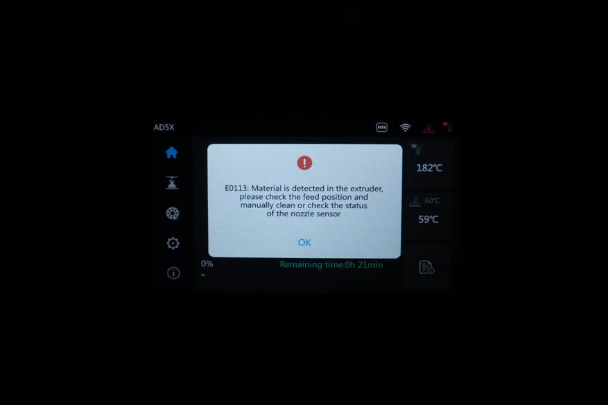 Я смог контролируемо воспроизвести две ошибки. На снимке слева принтер предупредил, что во время печати не было обнаружено движение прутка через модуль IFS, после чего попытался извлечь филамент, но датчик в экструдере остался активным, а значит что-то где-то застряло. После устранения «засора» печать продолжилась с того же места.
