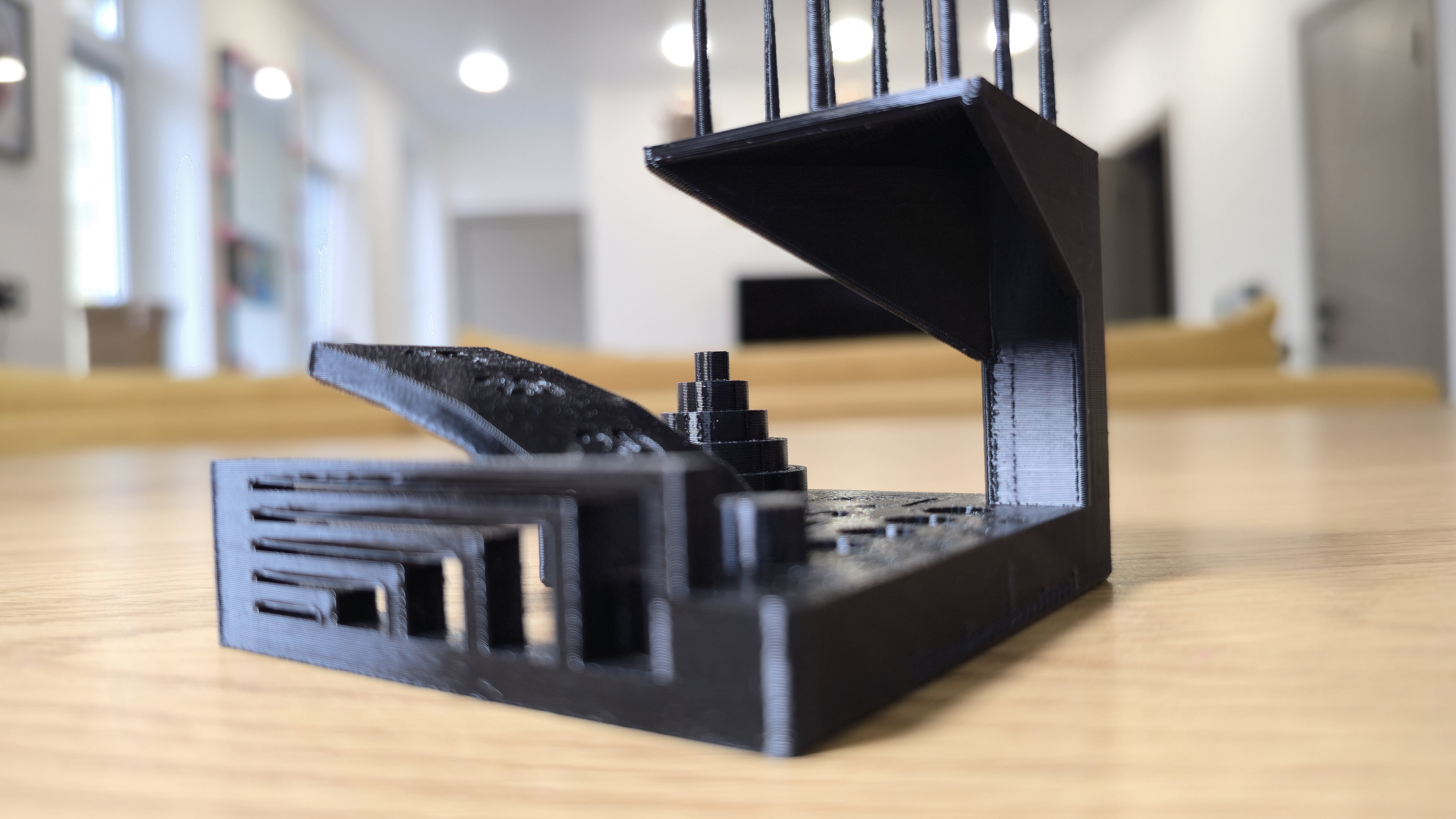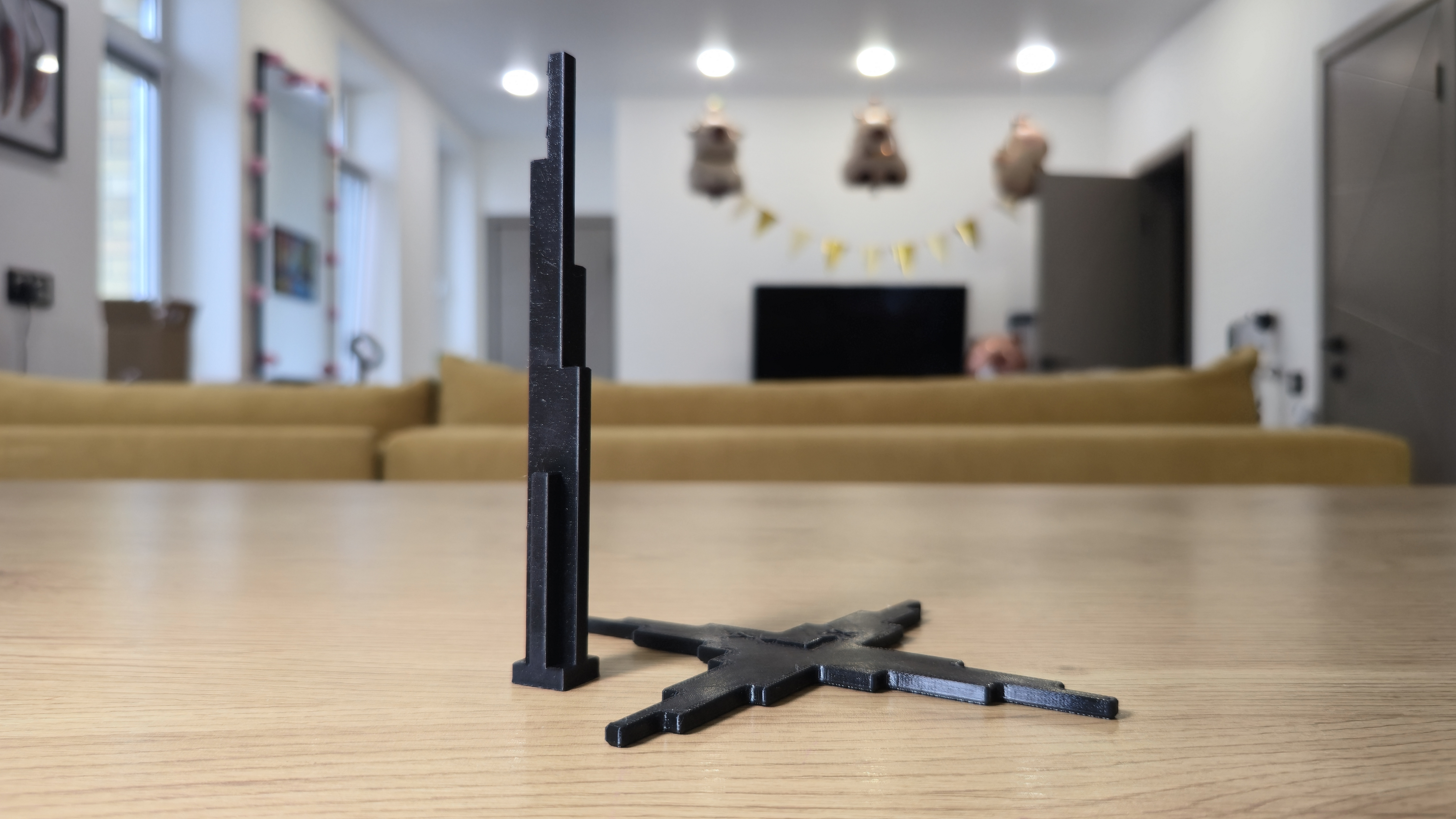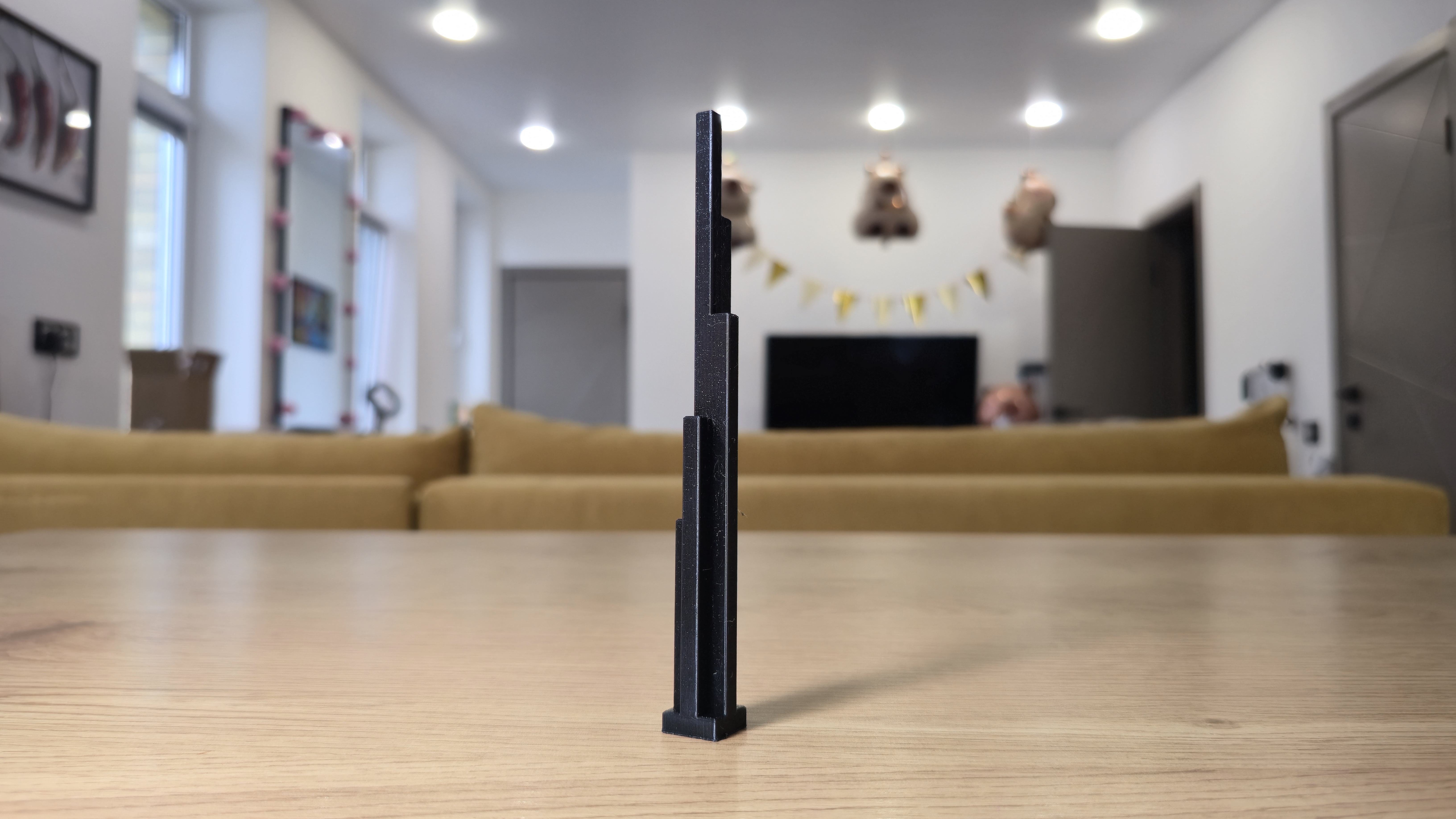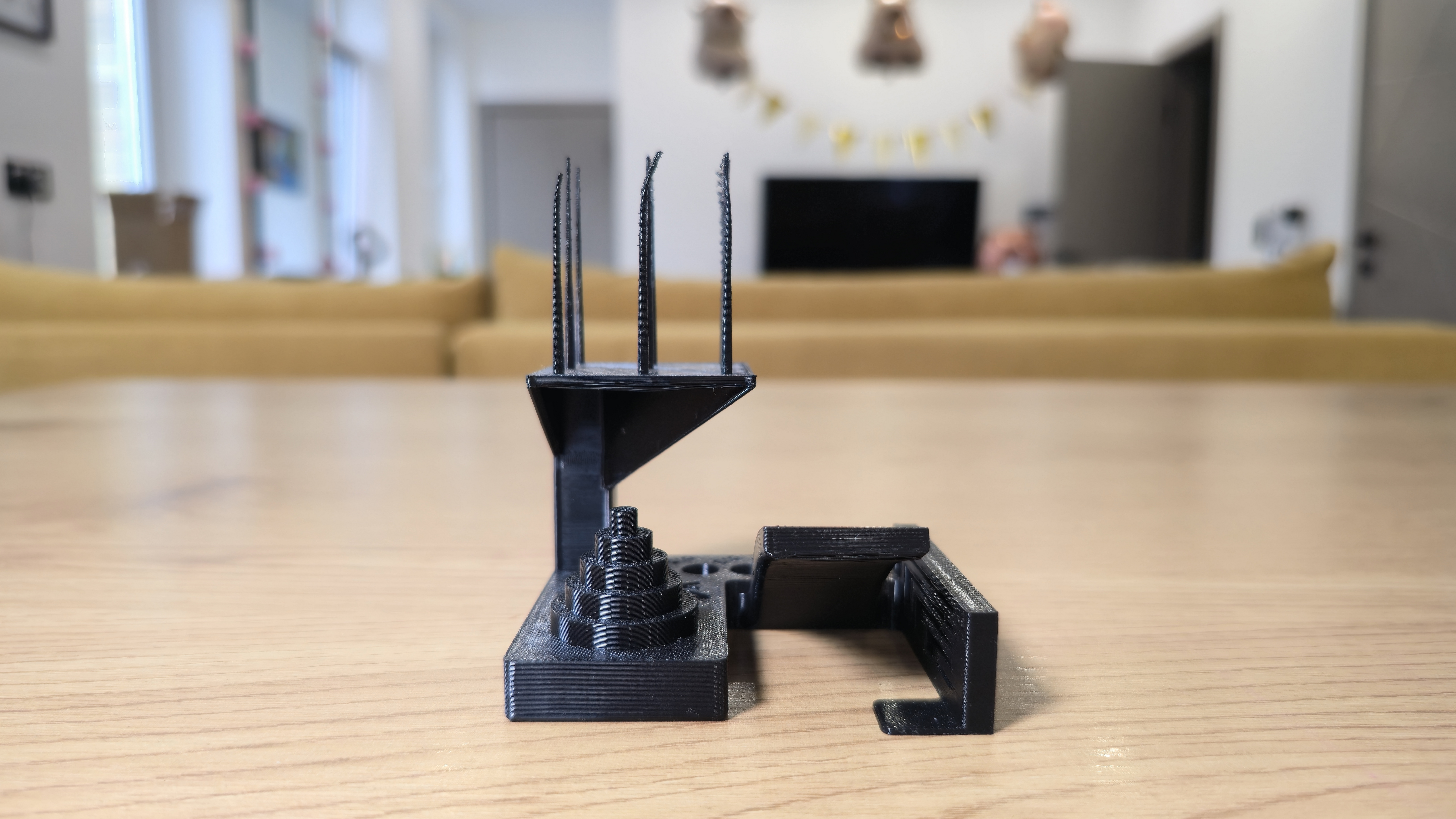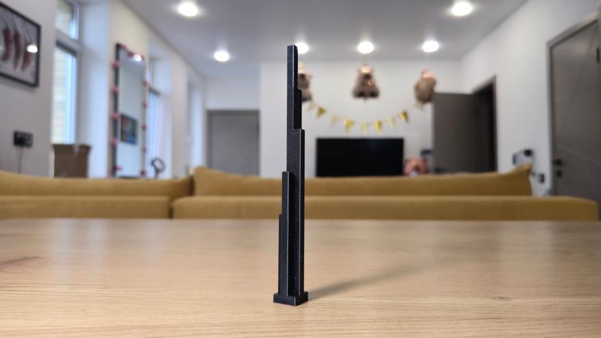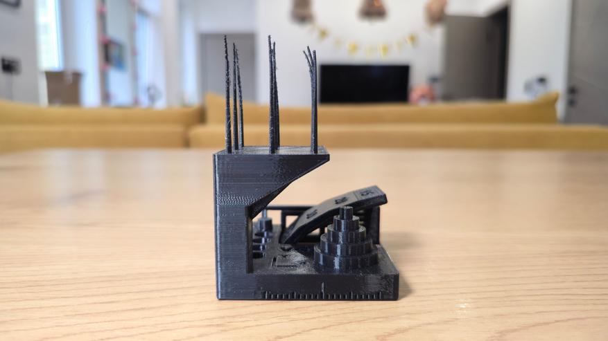 Навесы отпечатаны вплоть до критических углов, при этом кромка остаётся относительно чистой. На мостах заметно лёгкое провисание, но они сохранили целостность и не разрушились. Шпили получились с характерной паутинкой, что объясняется отсутствием подстройки параметров ретракта. После печати я попробовал убрать тонкие нити бытовым феном, но поток воздуха оказался слишком сильным, и часть шпилей повело. На фото видно, что они наклонены — это не дефект печати, а результат постобработки.