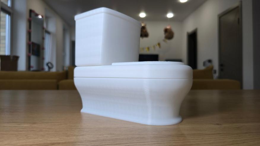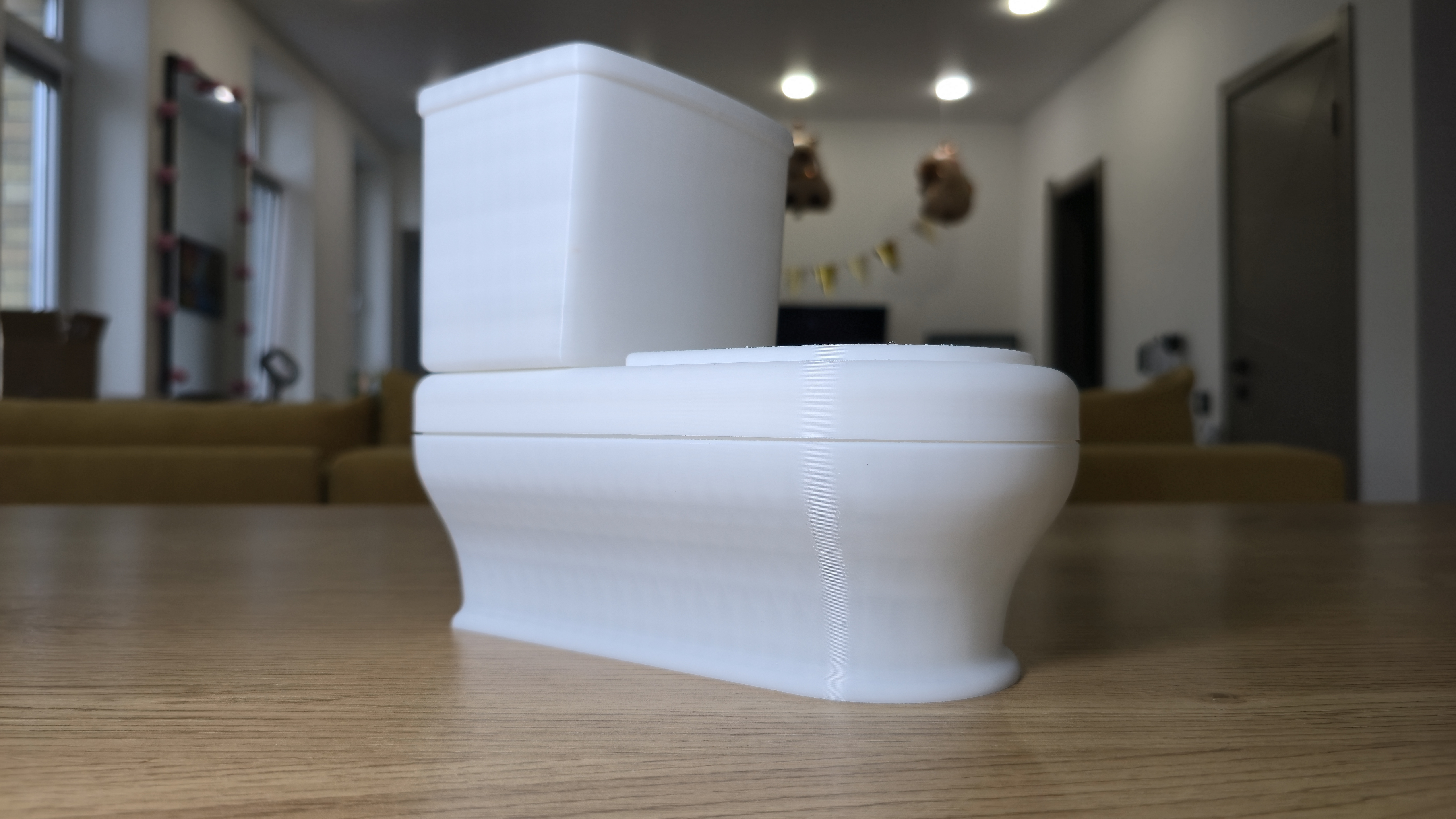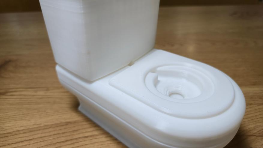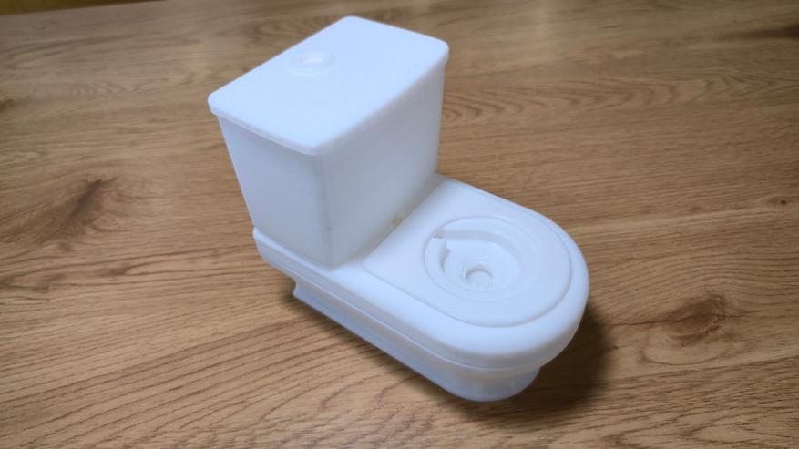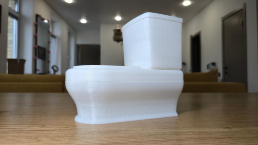 В завершение я решил напечатать сборную модель «унитаза для кисточек». Это не просто декоративная вещь. В внутрь наливается вода, и получается емкость для промывки кистей при рисовании. Заказ, как ни странно, пришел от сына, и получилось вполне функционально.