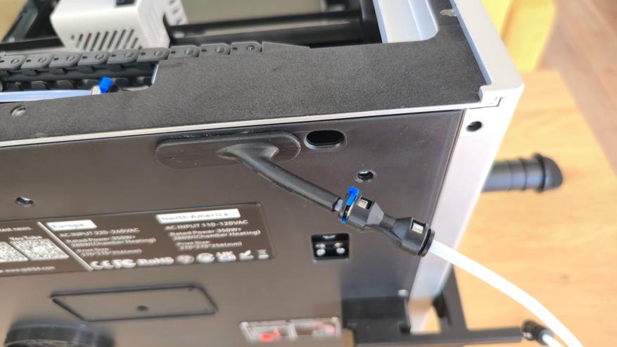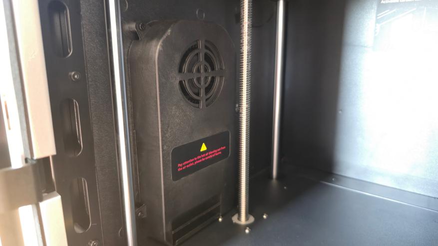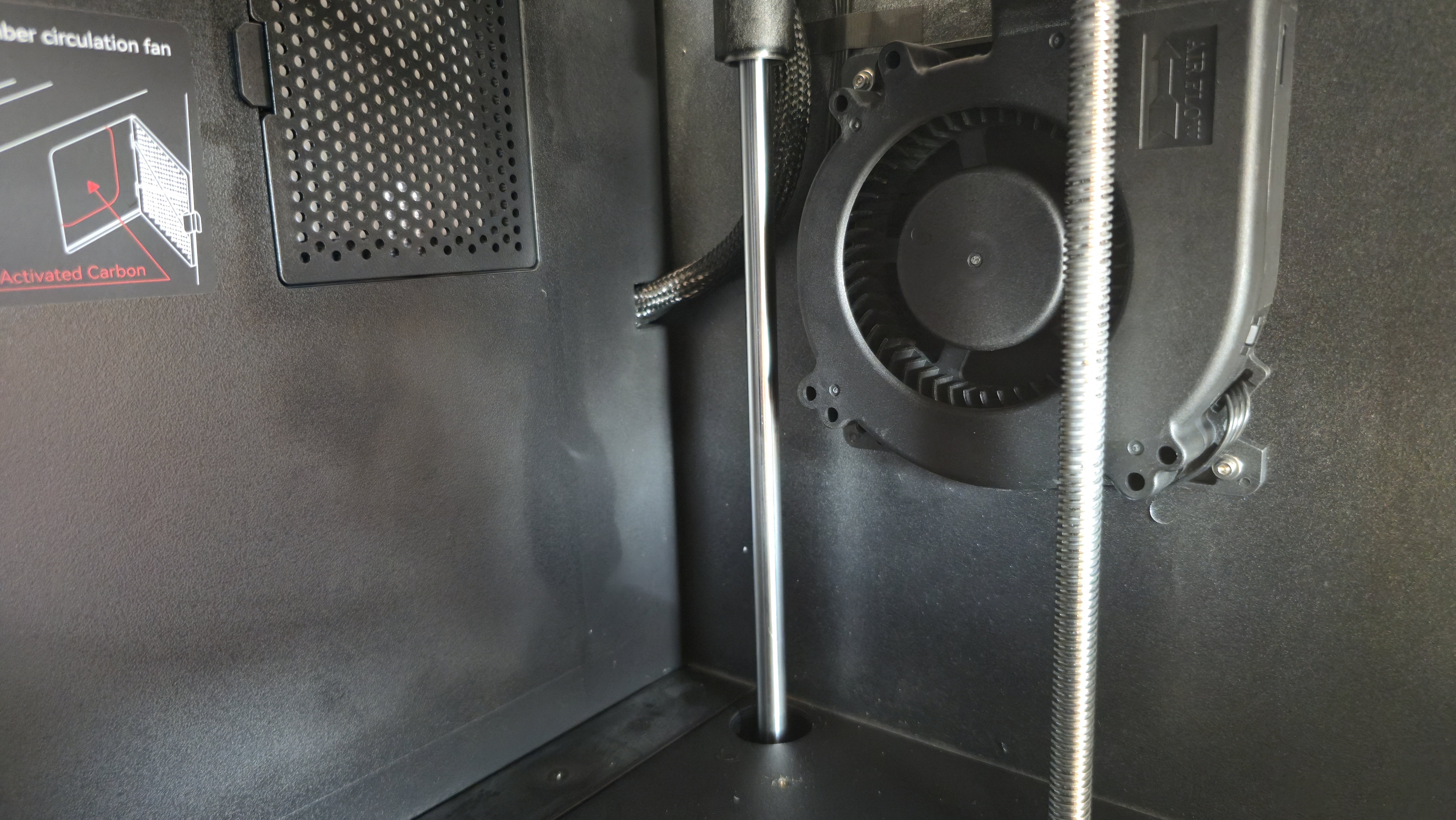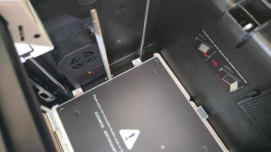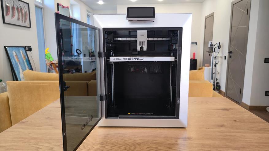 По конструкции движущихся узлов применяются линейные рельсы по оси X, зубчатые ремни с шагом 1.5 и винтовые пары оси Z с заводской смазкой. Для стабильной работы внутри камеры установлена система фильтрации с угольным и HEPA-элементами, а также вентилятор для циркуляции воздуха. Встроенная камера с разрешением 1080p позволяет вести наблюдение за печатью, одновременно поддерживаются функции искусственного интеллекта для обнаружения ошибок или сбоев в процессе.