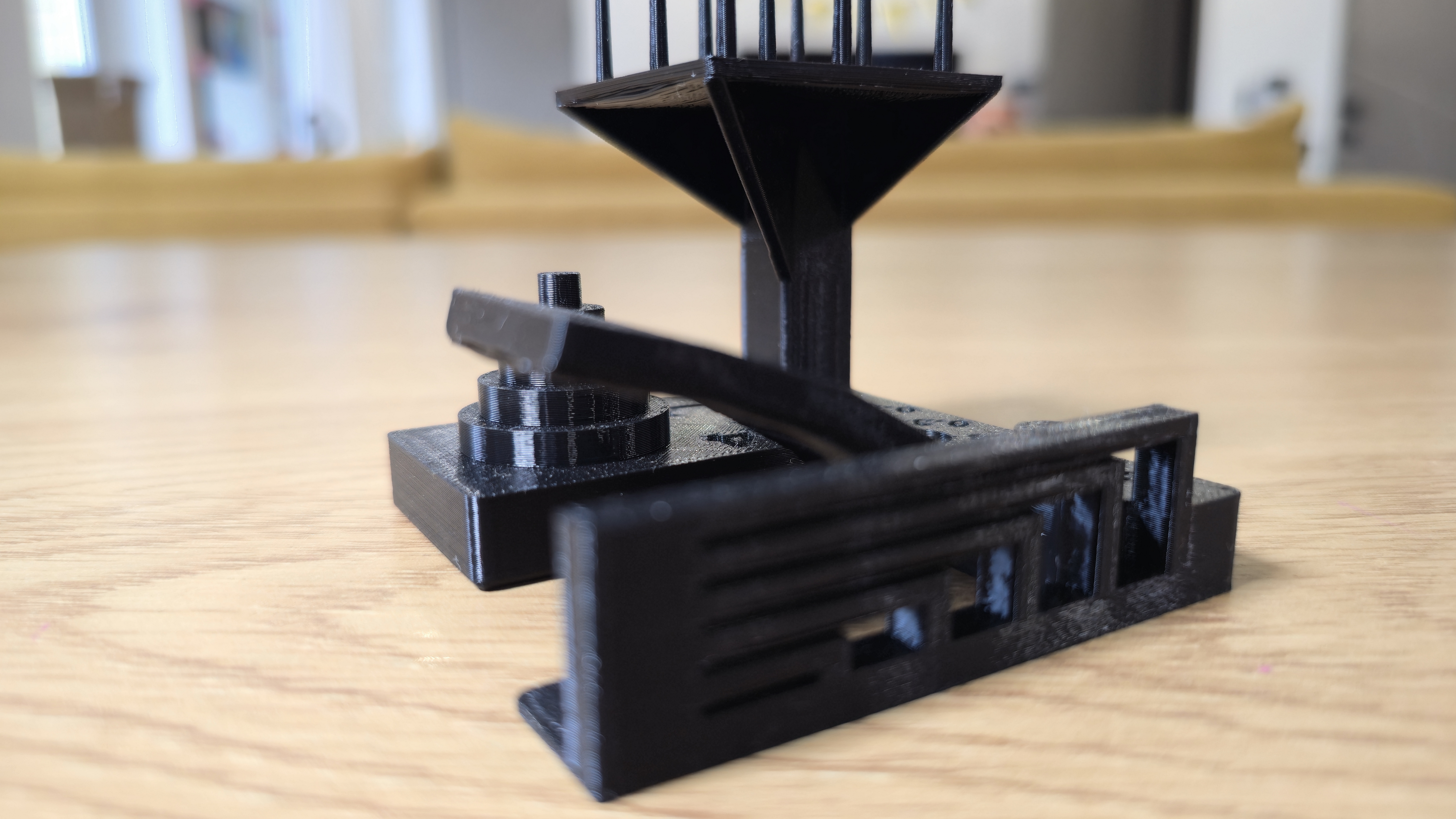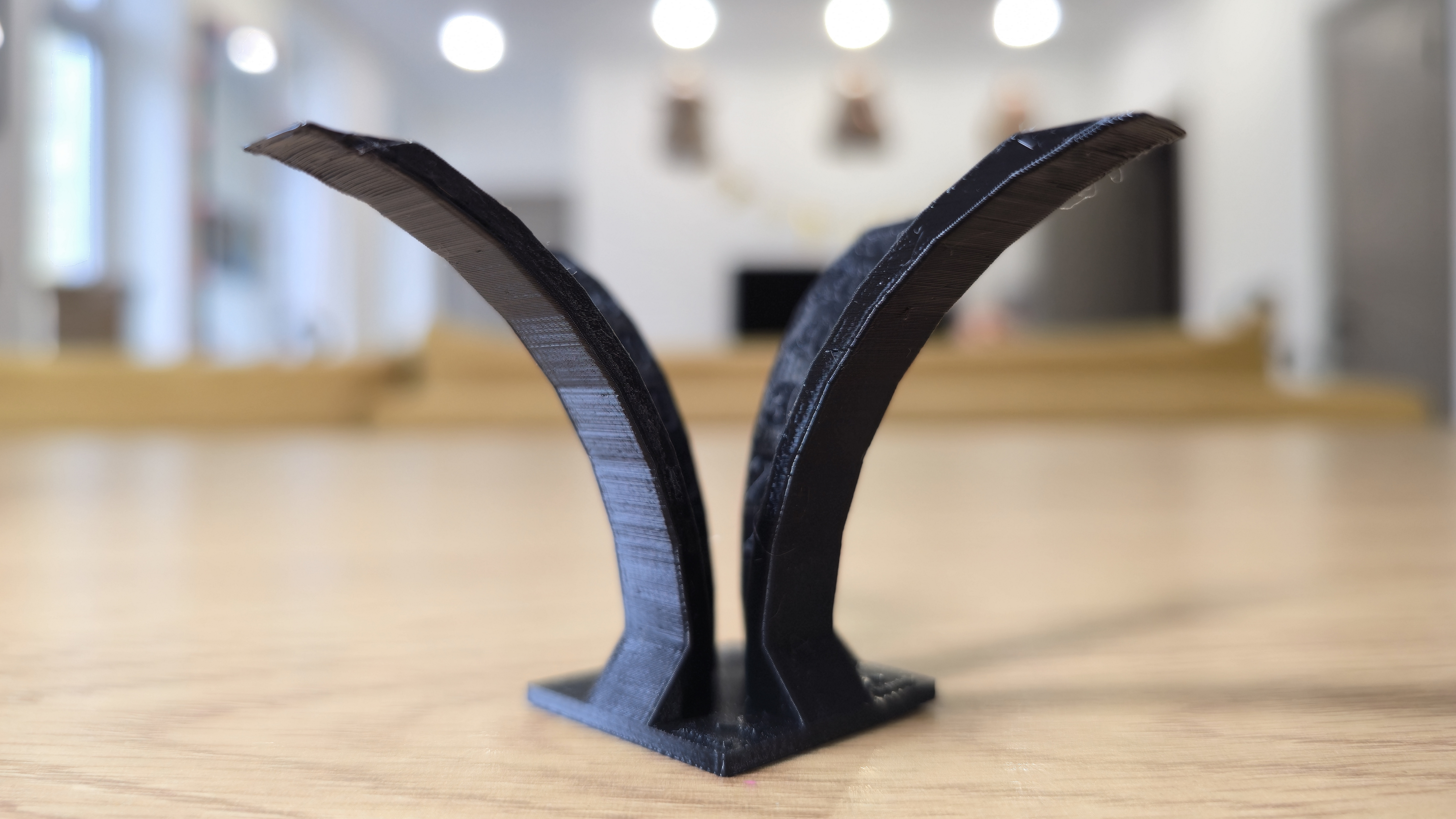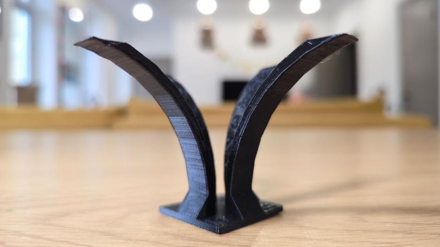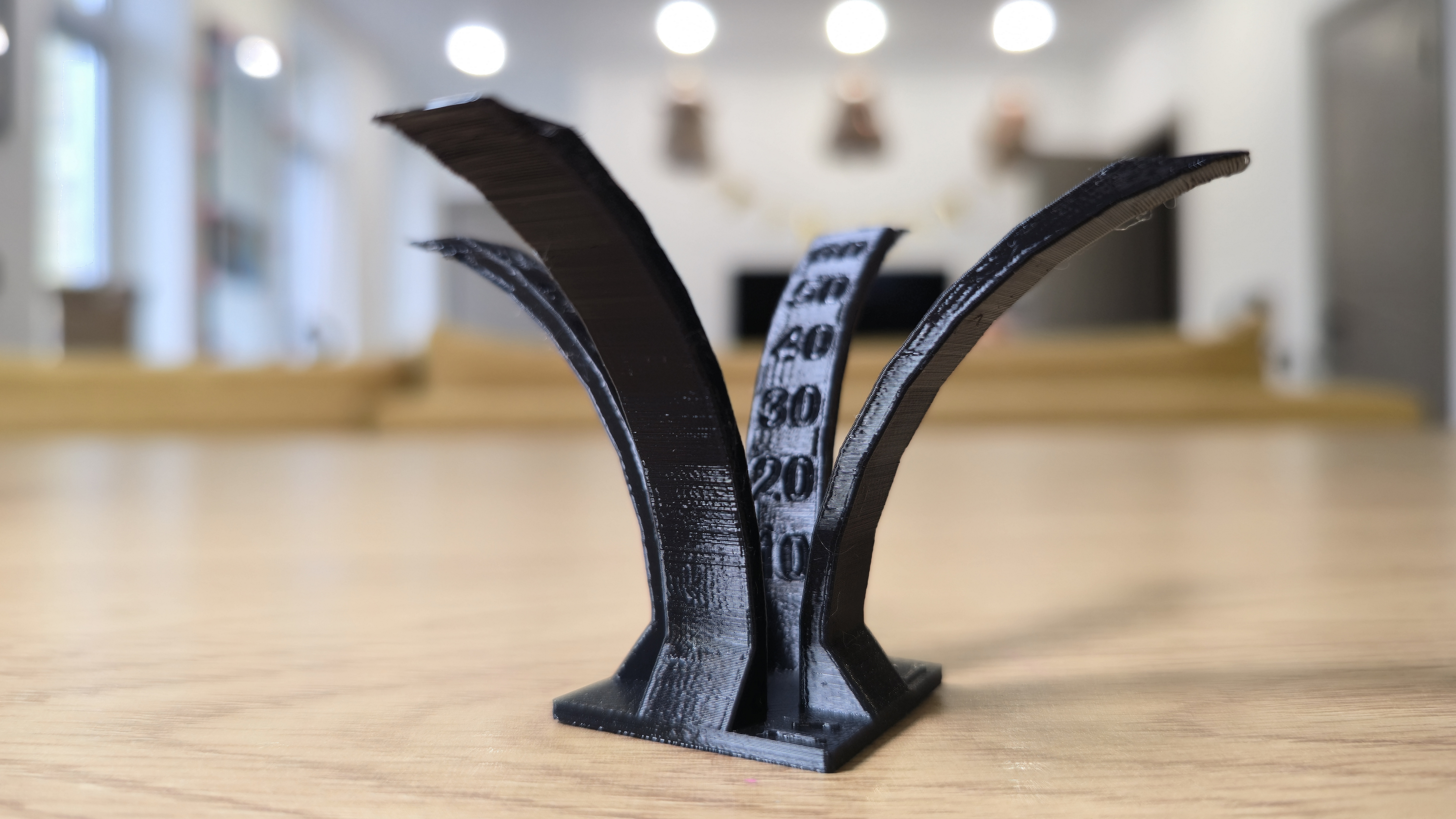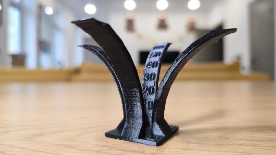 Очередная тестовая модель с изгибающимися дугами предназначена для проверки способности принтера печатать нависающие и постепенно увеличивающиеся углы без поддержки. Несмотря на то, что филамент закончился и верхние слои не были завершены, итоговый результат даёт понимание о работе устройства. Боковые поверхности получились довольно ровными, слои легли последовательно, без явных пропусков или перекосов. На изгибах заметна легкая паутинка и тонкие нити, что характерно для печати без дополнительной калибровки ретракта.