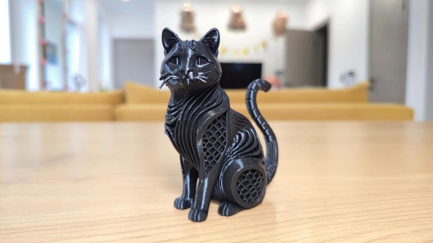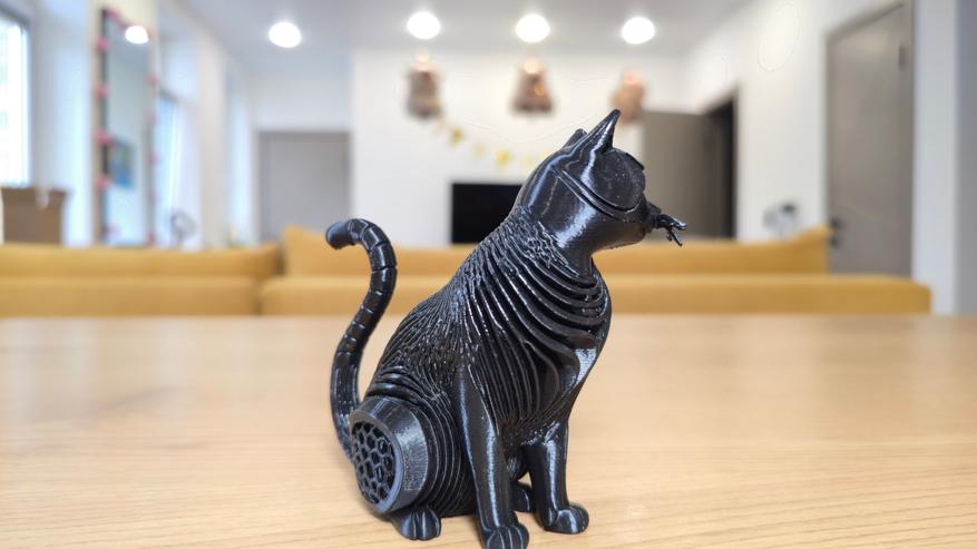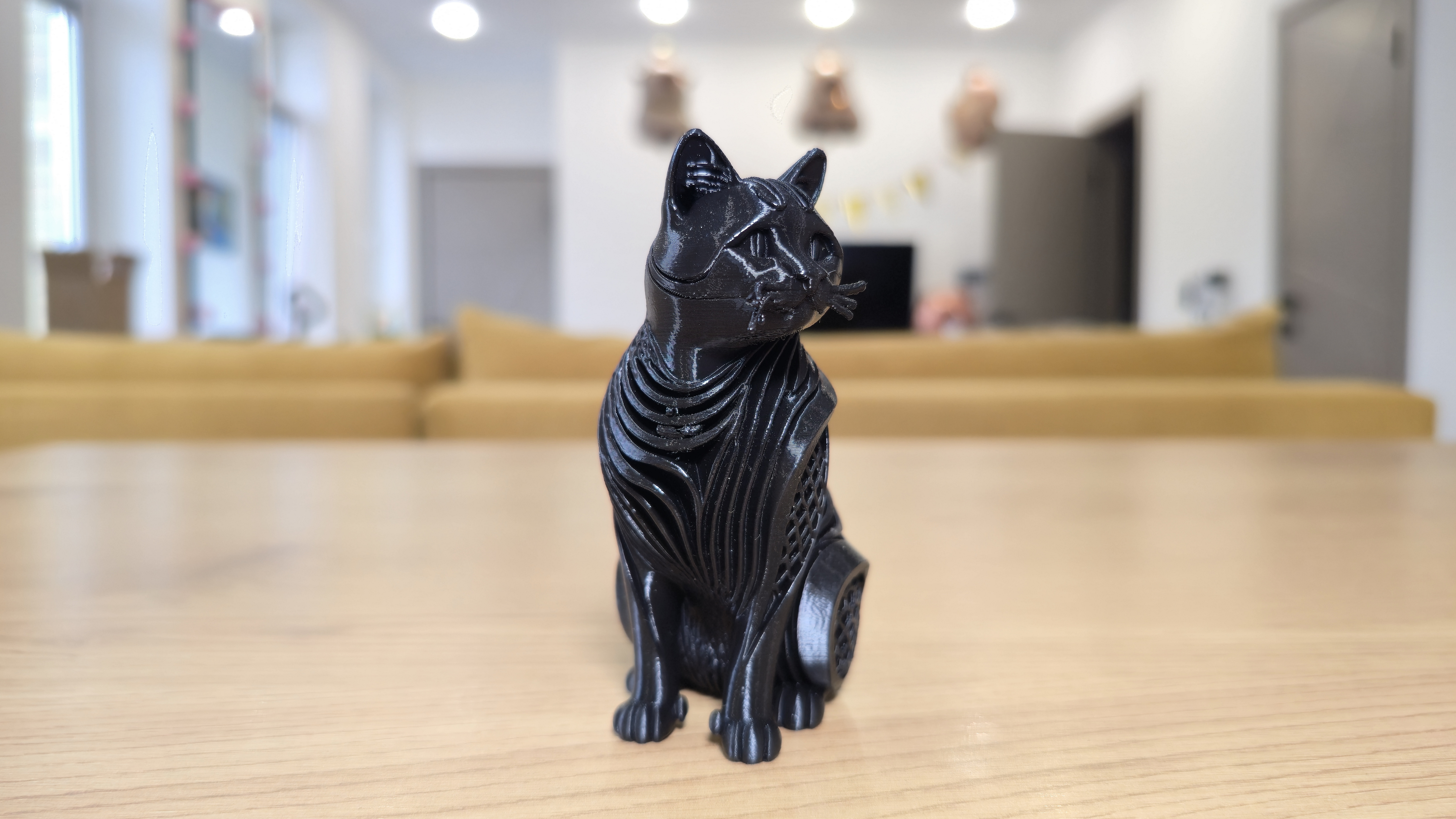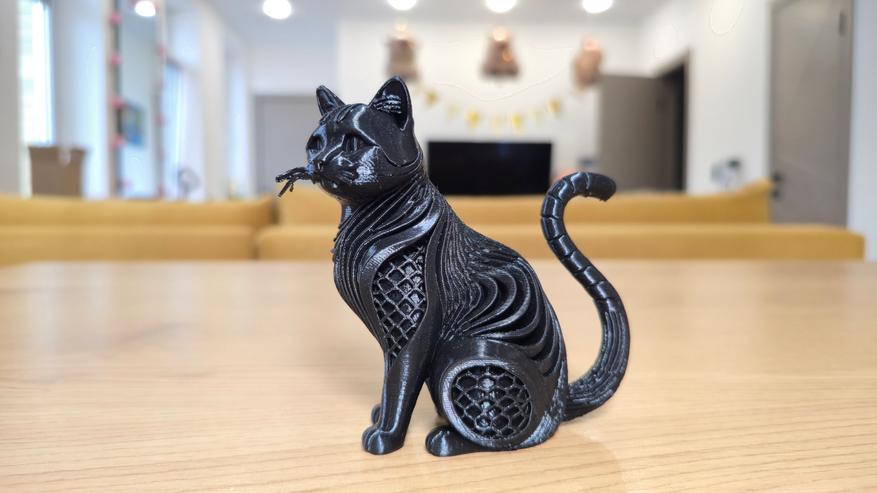 Потом я попробовал распечатать декоративную модель — кошку с пустотами внутри. Фигура достаточно детализированная, с плавными переходами и тонкими элементами. Принтер справился с формой: видны аккуратные контуры, ровные слои, без явных пропусков или деформаций. Все линии, которые идут по изгибам корпуса, легли равномерно, без смещения.