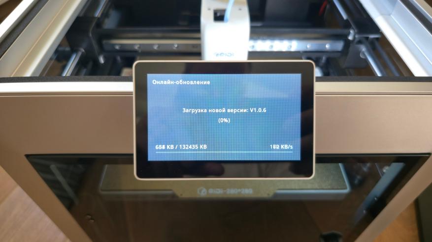 При включении система предлагает выбрать язык интерфейса и пошагово проводит через сценарий подготовки. Принтер напоминает снять фиксирующие винты, поднимает стол и освобождает пространство под платформой от пены. Далее он выполняет самопроверку узлов, проверяет механику и электронику, а затем автоматически выравнивает рабочую поверхность и строит карту стола. Этот процесс занимает несколько минут и проходит полностью в автоматическом режиме.