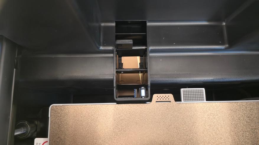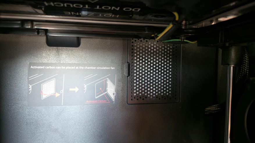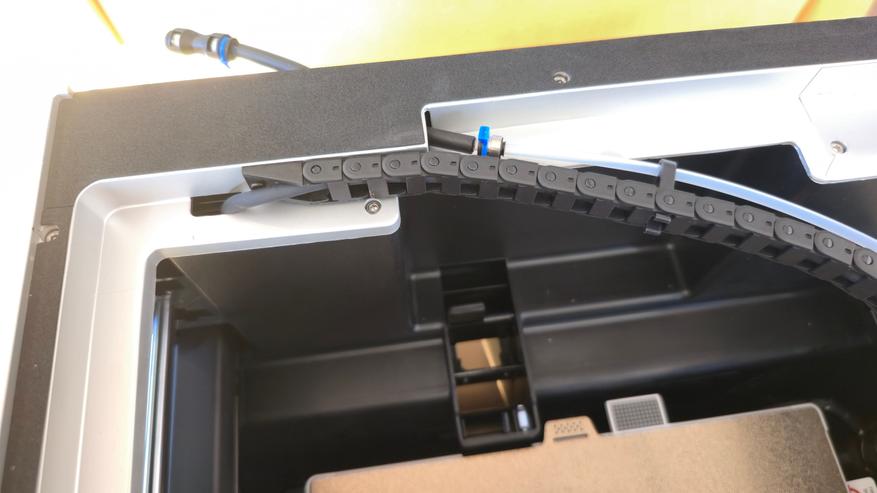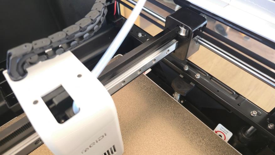 В задней части камеры есть узел очистки сопла — это специальная площадка, куда печатающая голова сбрасывает излишки пластика перед началом печати. Сама печатающая голова перемещается по рельсам X и Y. Внутренние кабели и трубки уложены в кожухи и кабель-каналы, благодаря чему они не мешают движению и защищены от повреждений. Узел печатающей головы прикрыт магнитной крышкой, которая легко снимается для обслуживания. Конструкция предусматривает датчики, нагревательные элементы и сопло, рассчитанное на высокие температуры.