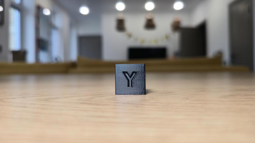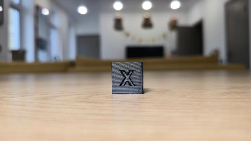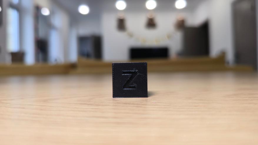На гранях видна лёгкая полосатость, особенно на стороне с буквой X. Это можно отнести к характерным артефактам PLA при печати на высоких скоростях, которые принтер держит даже без подстройки. На букве Z заметна тонкая ниточка, типичная «паутина» от ретракта, но её немного и для стокового профиля результат можно считать показательным.