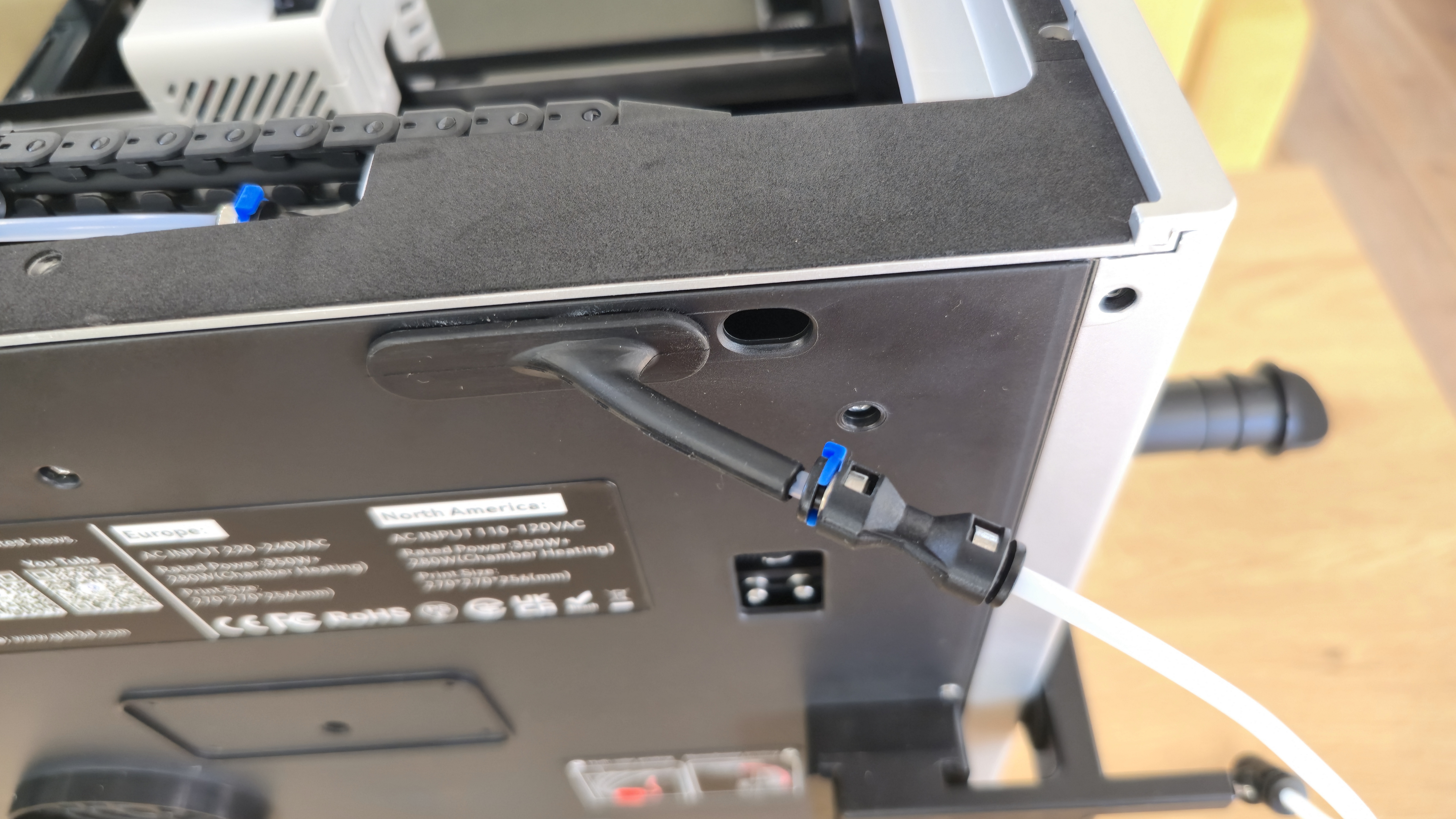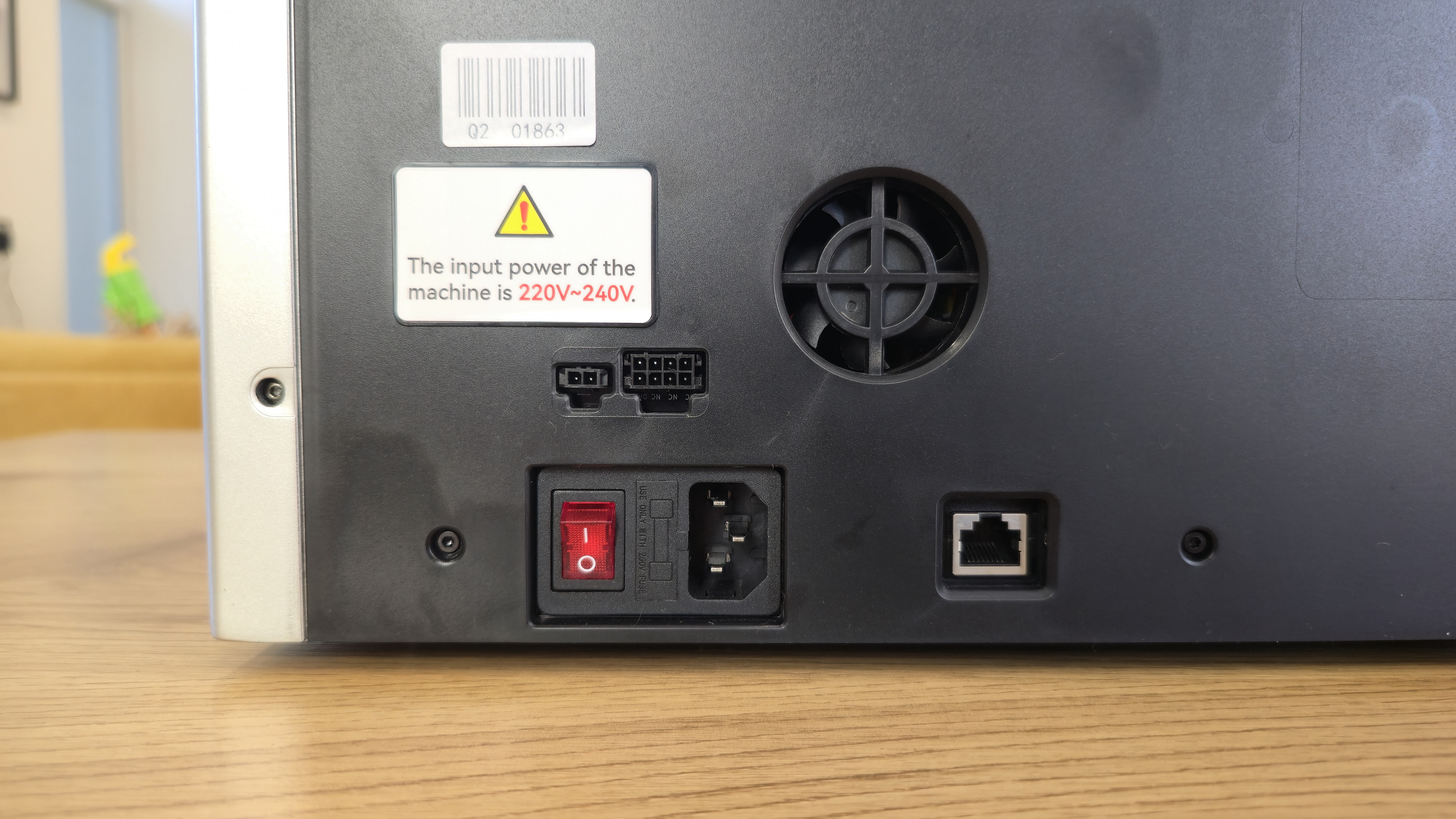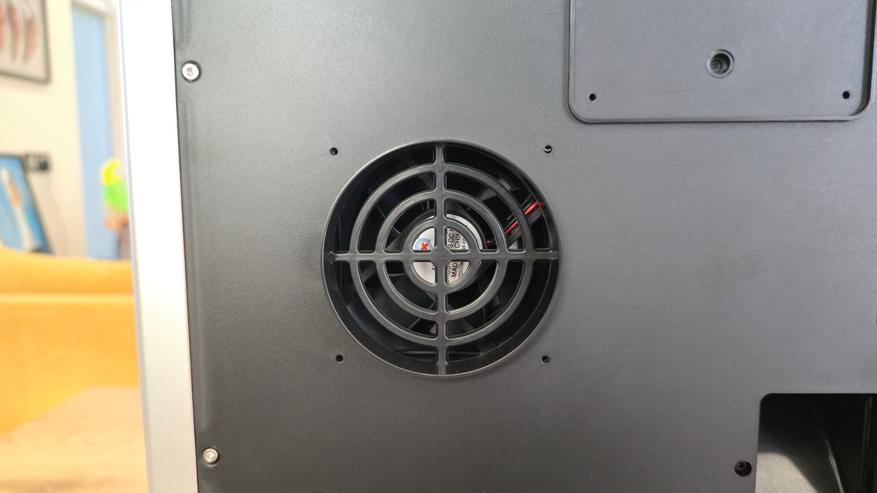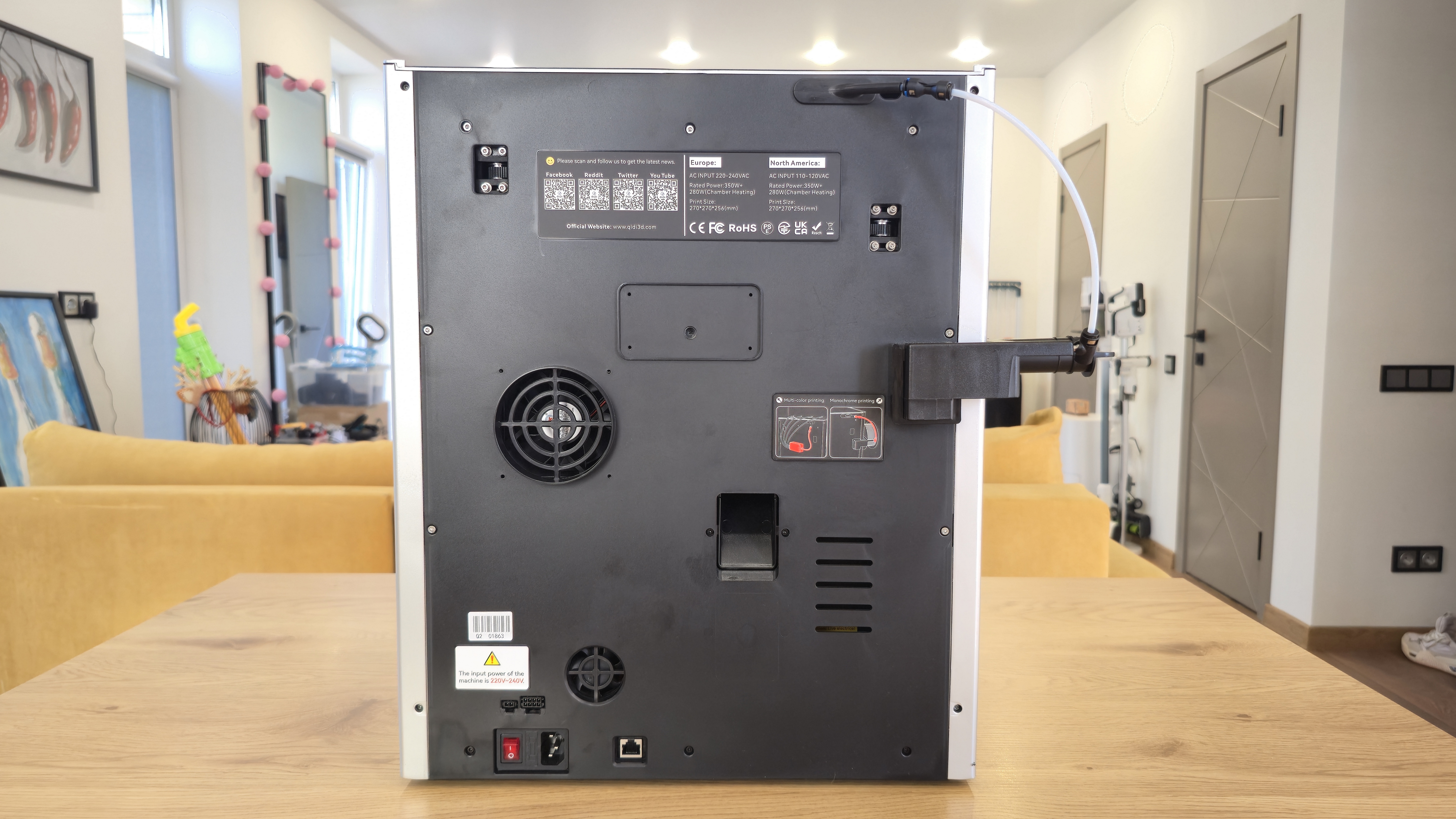 Задняя панель собрана максимально функционально. В нижней зоне находится разъем питания и тумблер включения. Здесь же расположен порт Ethernet для подключения к локальной сети. Ниже выведены сервисные разъемы, включая BOX-интерфейс и канал для вывода обрезков пластика. В верхней части панели размещен механизм натяжения ремня, а также вентиляционные решетки. Именно через эту часть корпуса осуществляется вывод воздуха из камеры.