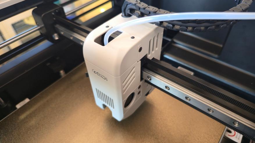 Сопло рассчитано на нагрев до 370 °C, а стол до 120 °C. Такой диапазон охватывает как простые материалы вроде PLA и PETG, так и технические, включая ABS, ASA, полиамиды, поликарбонат, а также композиты с наполнением из углеродного или стеклянного волокна. Встроенный датчик в головке используется для автоматической калибровки и не зависит от поверхности стола, что делает процесс выравнивания универсальным. В дополнение реализована функция input shaping и ускорение до 20000 мм/с², благодаря чему устройство рассчитано на скорость печати до 600 мм/с.