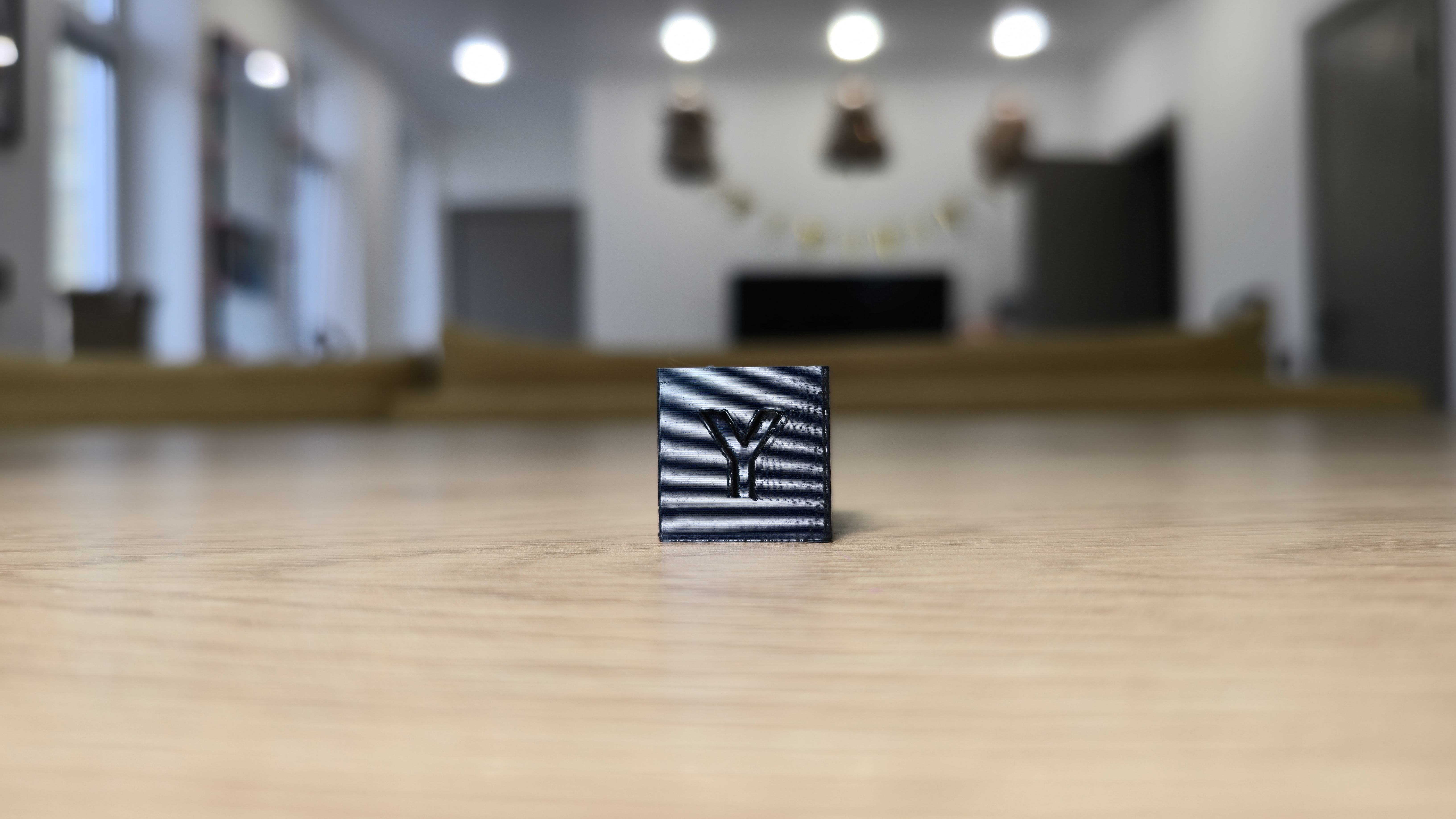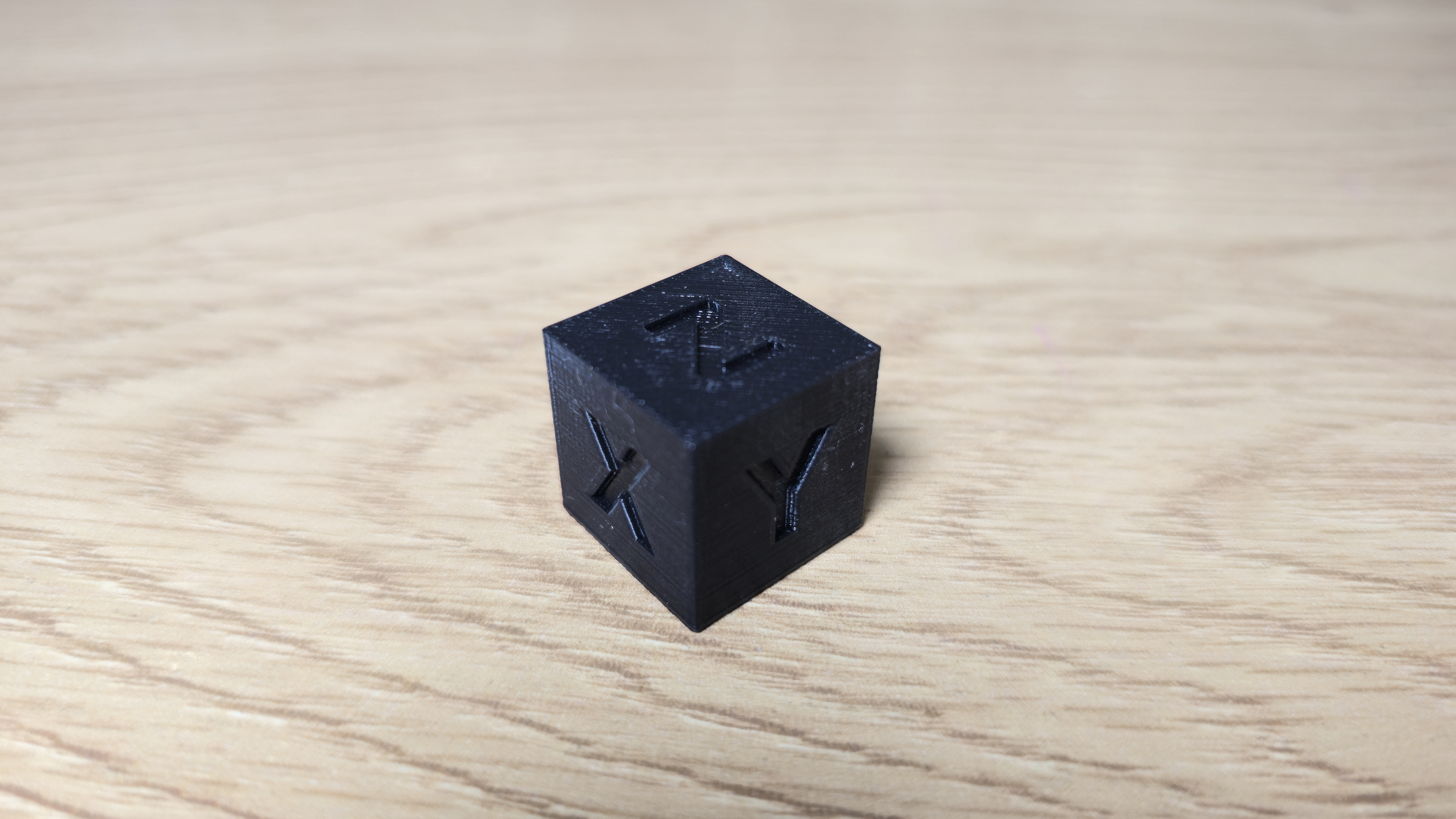 Куб получился ровный, с чёткой геометрией, буквы на гранях читаются без смазывания. По вертикали хорошо заметна структура слоев, но они укладываются равномерно и без смещений. Это значит, что кинематика работает правильно, люфта в осях нет. Углы куба получились прямыми, завалов не наблюдается, что говорит о корректной калибровке стола и стабильном температурном режиме.