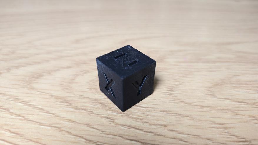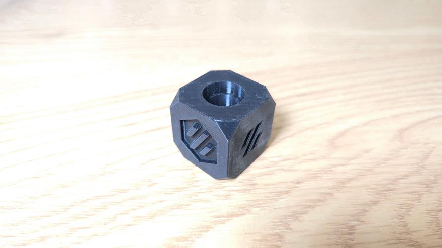 Далее идет уже более сложный куб. На нем одновременно видны и сквозное отверстие, и плоские поверхности, и гравировка. Печать шла на стоковом профиле PLA, без изменений в слайсере.