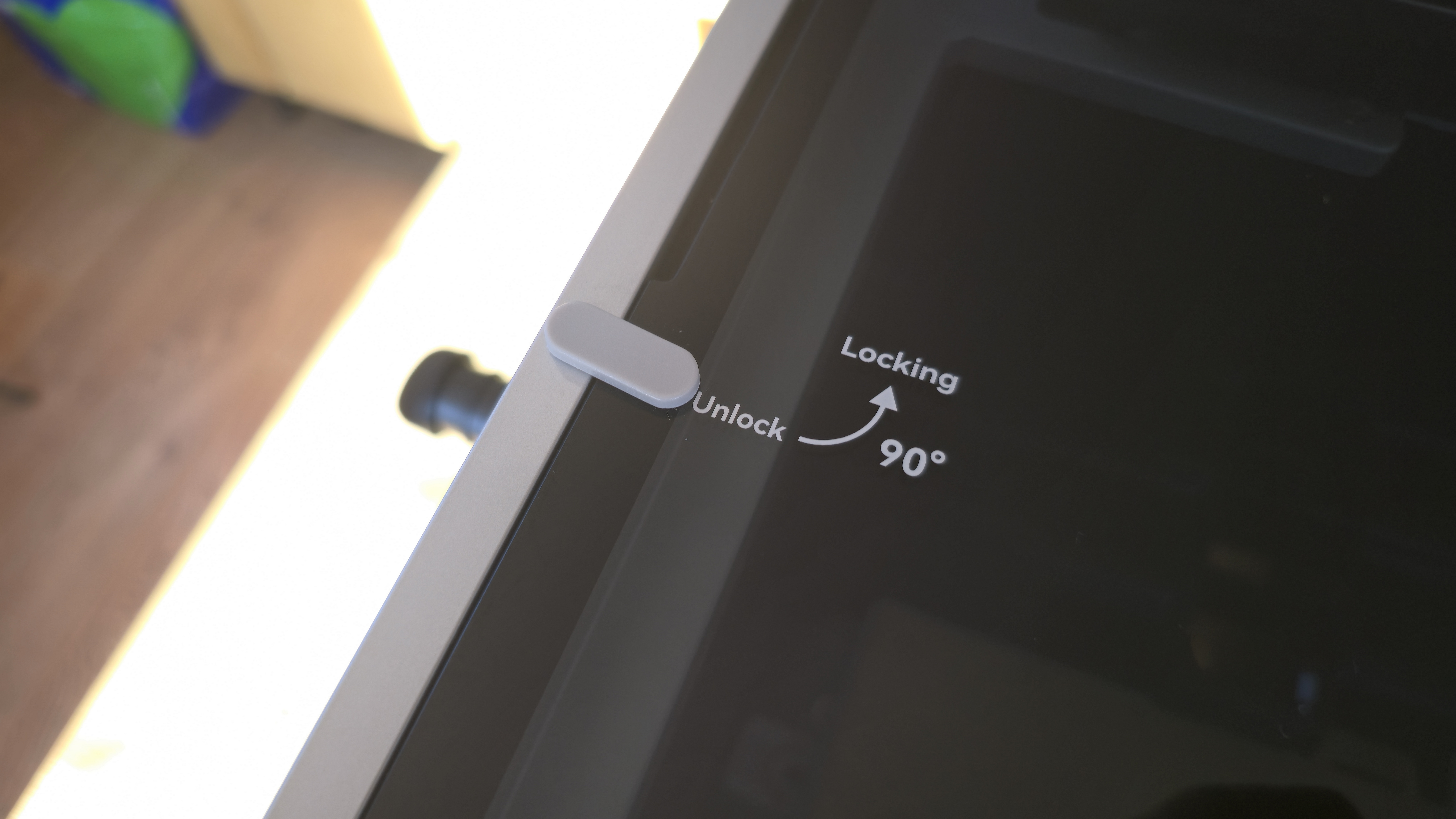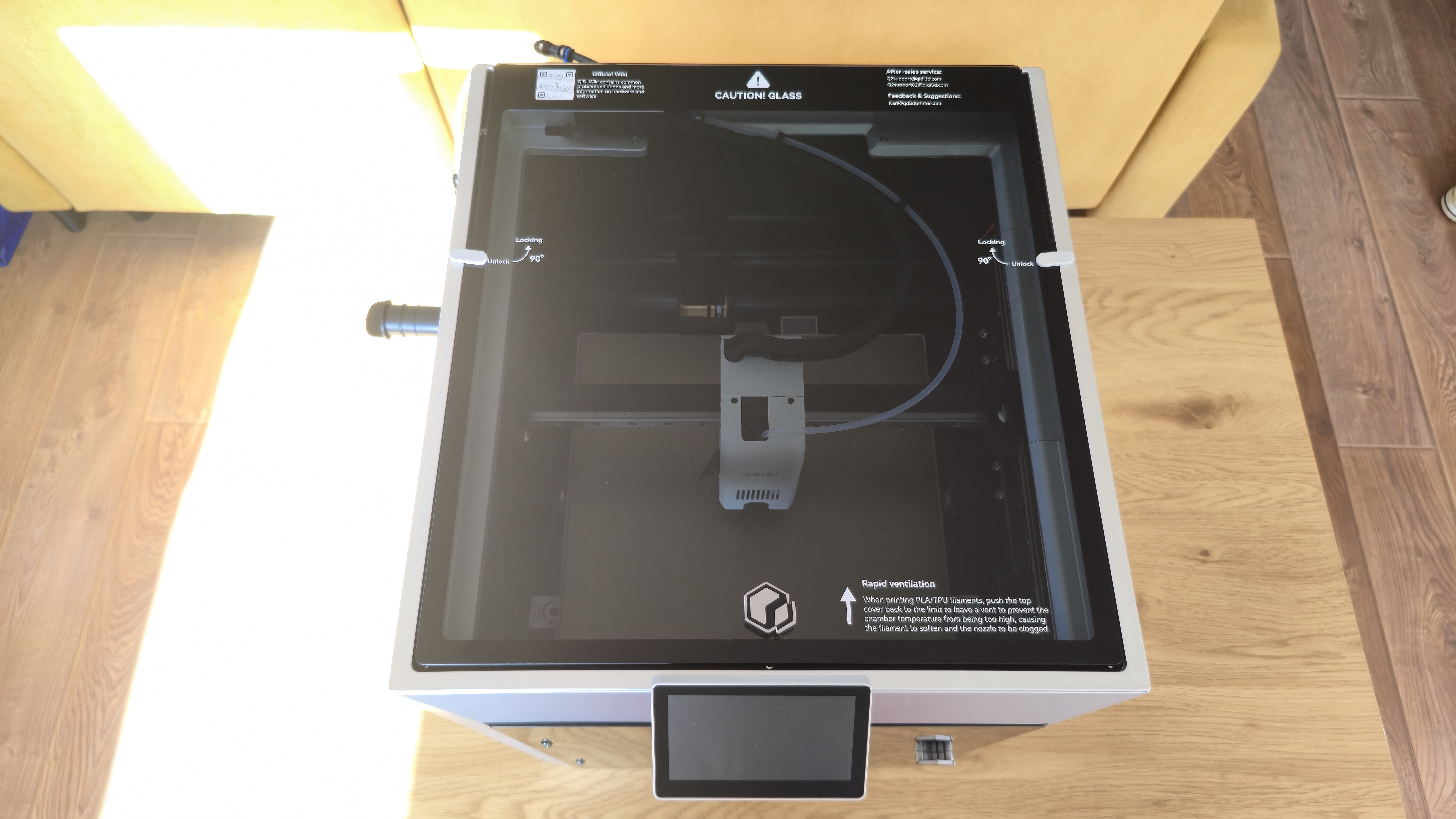 Верхняя часть корпуса закрыта стеклянной крышкой. Она фиксируется двумя поворотными зажимами. Снимается путем простого поднимания вверх. При закрытой крышке камера полностью герметична, и тут нужно понимать, что при печати материалами вроде PLA крышку можно приоткрыть, чтобы снизить нагрев внутри.