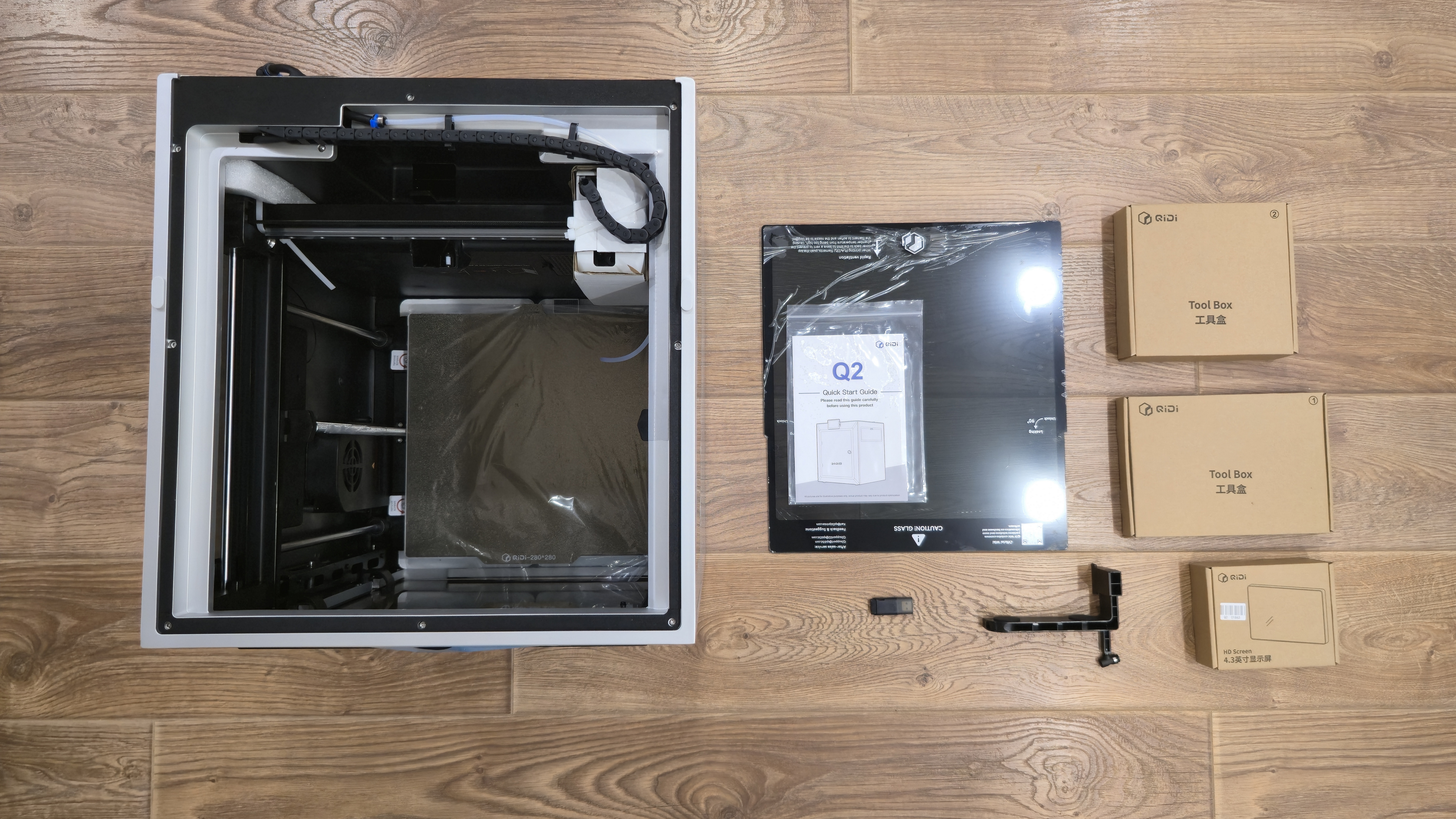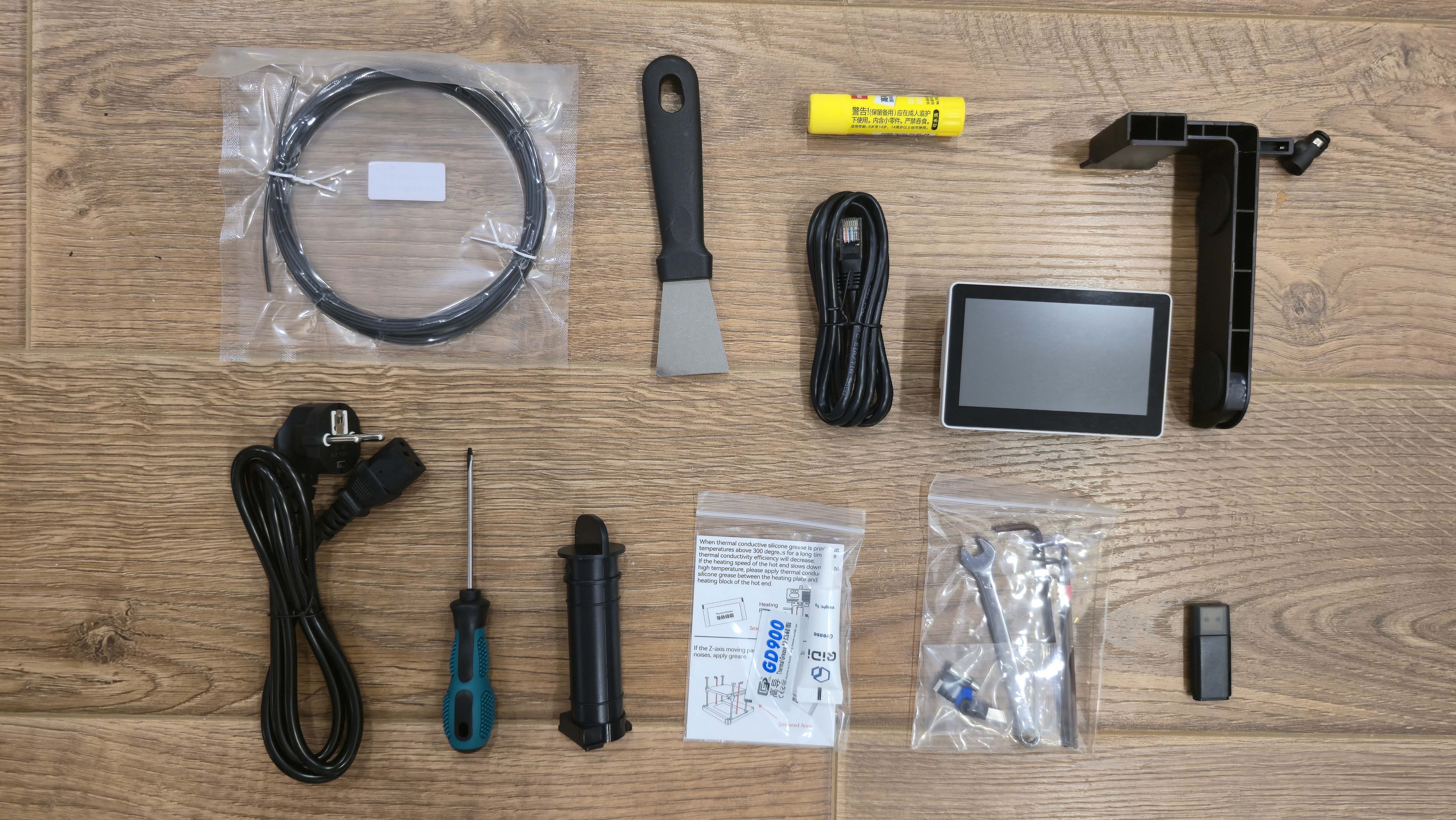 В комплект поставки входят сам принтер, стеклянная верхняя крышка, руководство пользователя, два бокса с инструментами и расходниками, а также отдельные элементы: кабели питания, экран управления, крепежные детали, шпатель, набор ключей, отвертка, клей-карандаш, и USB-накопитель.