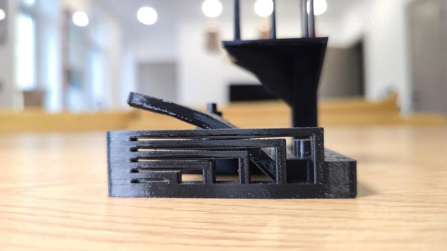 По общей геометрии видно, что вертикальные поверхности получились ровными, слои легли достаточно аккуратно. Буквы и мелкие элементы читаемы, грани имеют чёткие очертания. Лестница с уменьшением размеров показывает, что принтер способен выдерживать достаточно тонкие перемычки без расслоений.