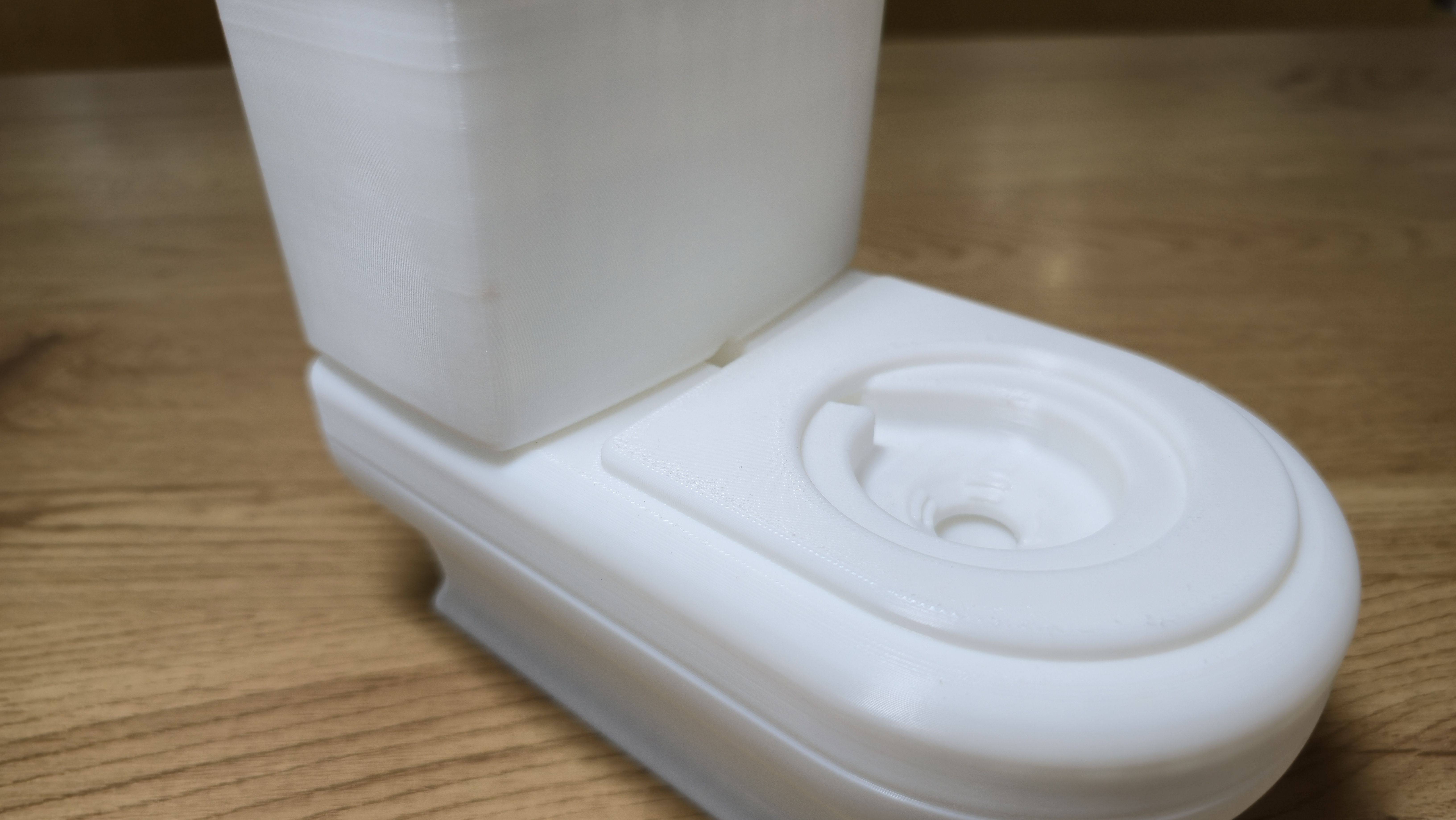 Печать выполнялась белым SBS-пластиком. Модель достаточно крупная, состояла из нескольких деталей, которые после сборки образуют единый корпус. В процессе хорошо видно, как принтер справляется с ровными стенками, плавными радиусами и сопряжениями элементов. Стыки крышки и чаши аккуратно совпадают, без видимых зазоров, что говорит о точности механики.